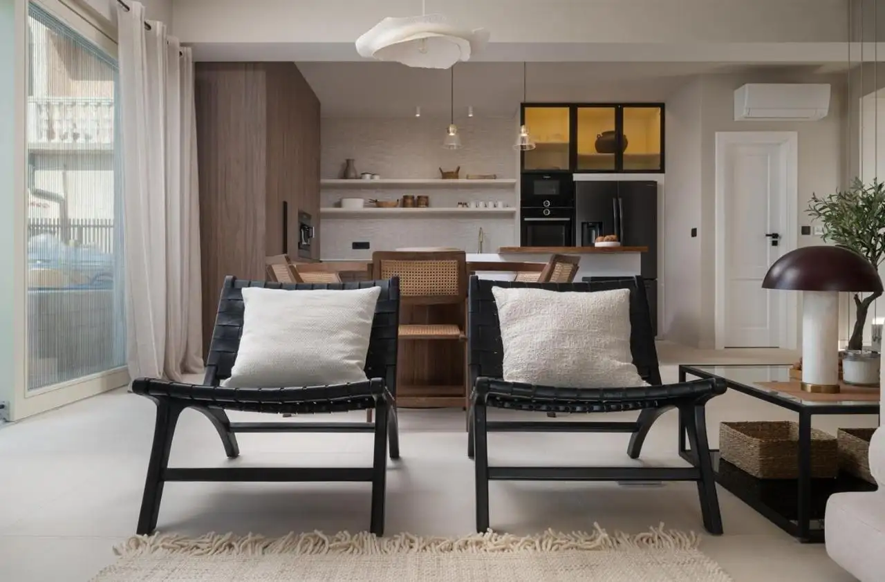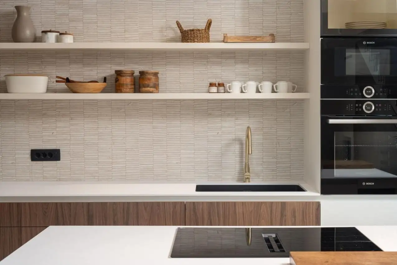 The kitchen is equipped with modern appliances, including a built-in coffee machine, a wine refrigerator, a floor-level hood and premium accessories. All building and finishing materials, including wooden structures, were selected for their aesthetic qualities, durability and energy efficiency.