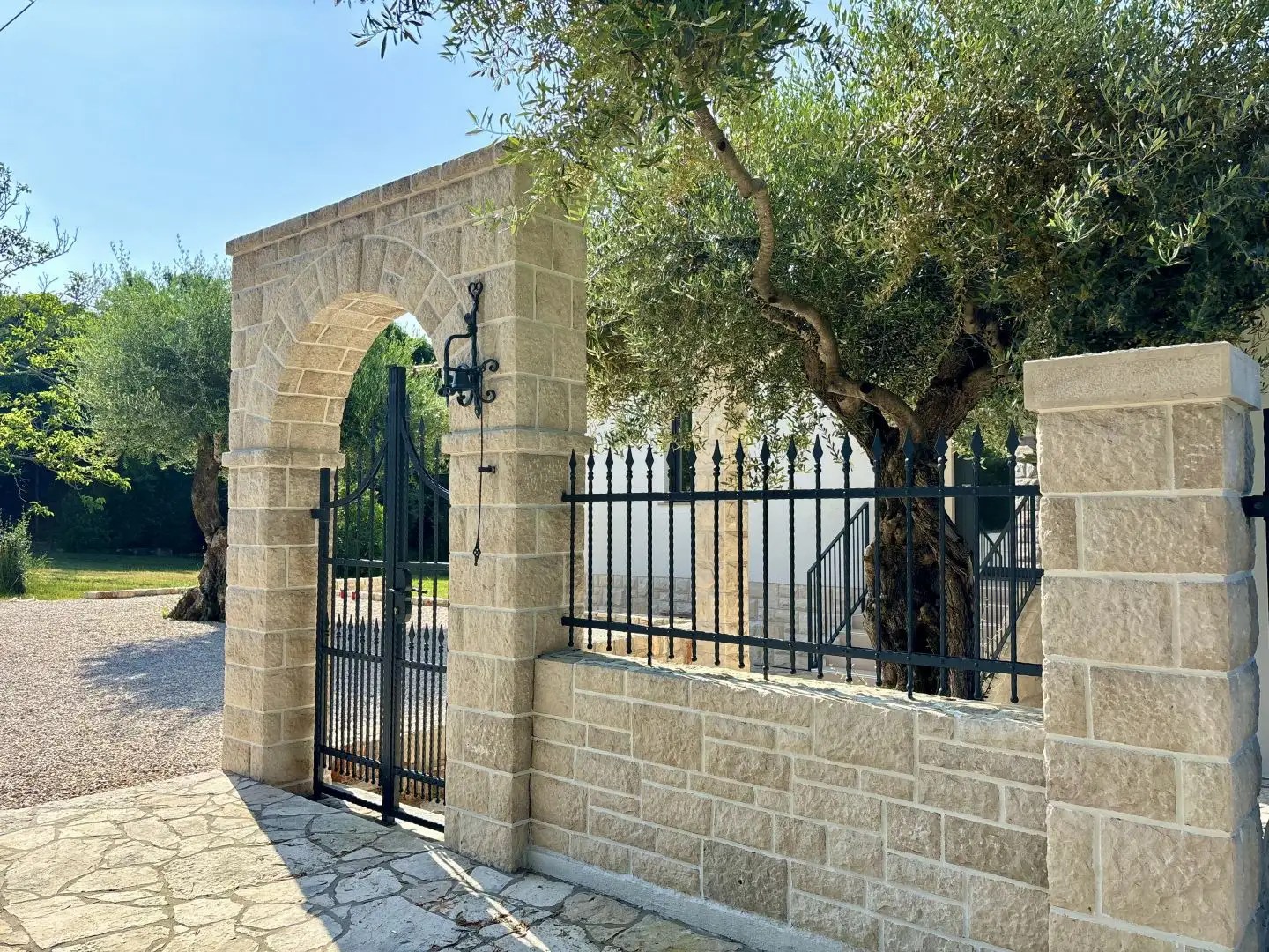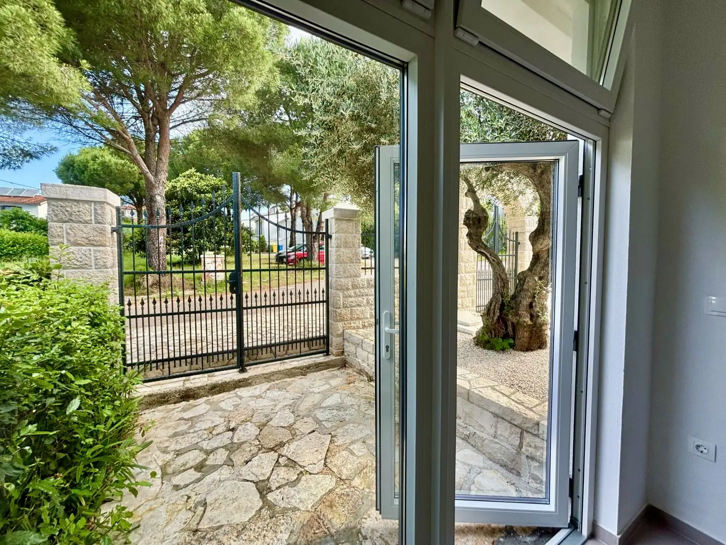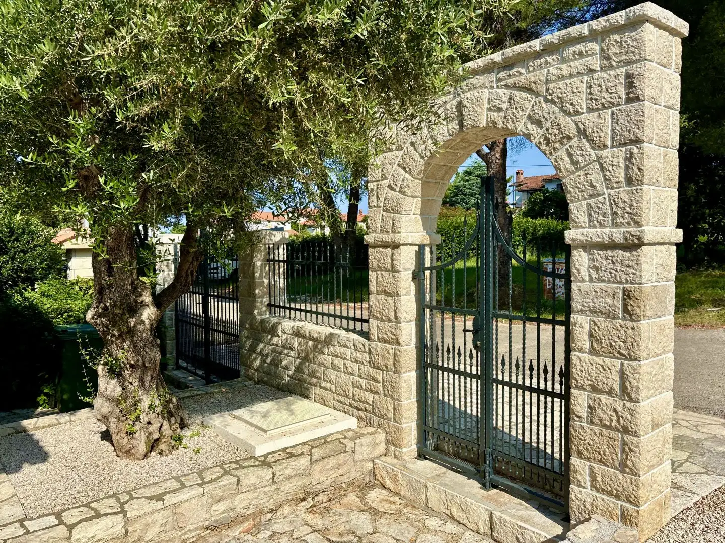 Located on a calm, green street near Umag, just 300 meters from the sea, this fully renovated facility offers 372 square meters of living space on a landscaped plot of 555 square meters. The ground floor offers sea views and the facility reflects the perfect combination of traditional Historian architecture and modern energy-efficient solutions. The house includes three independent apartments, each with a separate entrance, a terrace and a courtyard plot. This layout makes the property ideal for multigenerational living, tourist rental or a combination of private use and investment. The exterior of the house emphasizes privacy and the Mediterranean atmosphere. The renovated stone wall and arched entrance group add character and authenticity. In the center of the courtyard is a pool measuring 10 x 4 meters with a waterfall, surrounded by a tanning area, palm trees and centuries-old olive trees.