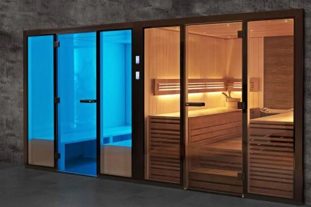 The 50 m² basement houses a wellness center with saunas and a storage room with a laundry area.