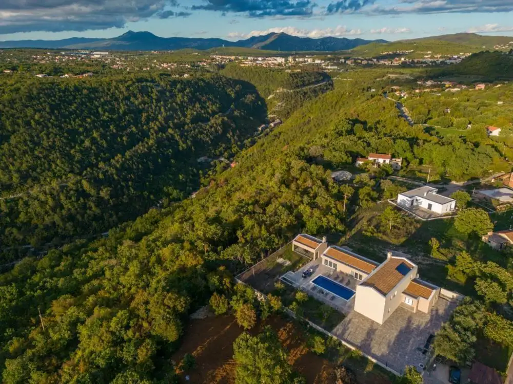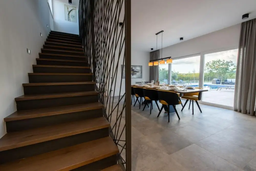 Expansive glass walls span the entire ground floor, offering views towards Labin and bathing the interior in ample sunlight, creating a harmonious blend with the surrounding nature and greenery. A staircase ascends to the first floor, which comprises three more bedrooms, each with its own private bathroom. One of these rooms provides access to a secluded terrace, perfect for ensuring privacy and intimacy.