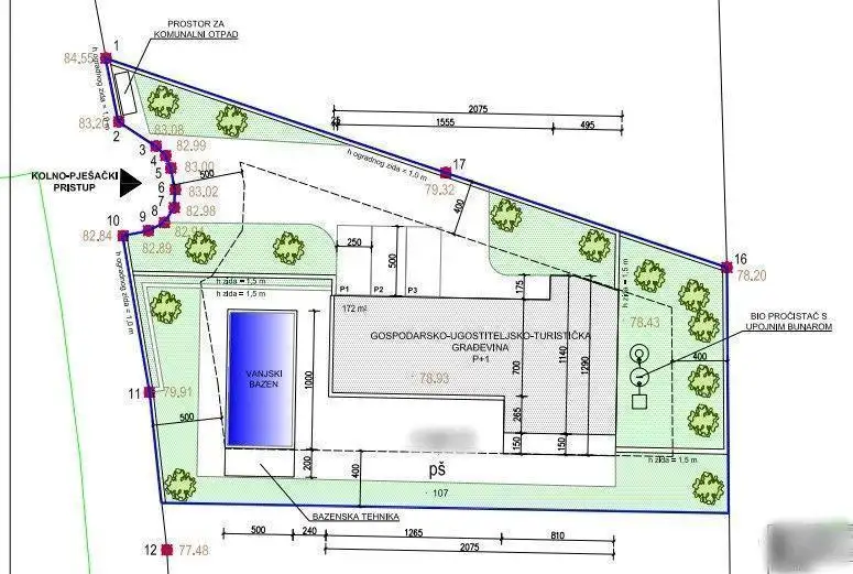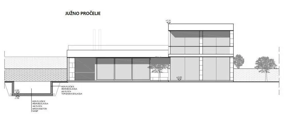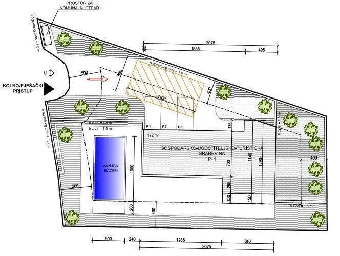 The swimming pool will be located on the western part of the building plot. The swimming pool will have maximum dimensions of 10.0m x 5.0m (internal water dimensions 9.60 x 4.60m), a depth of 1.5m and a usable area of 44.16 m2. The shell of the swimming pool is made of waterproof reinforced concrete with a thickness of 20.0 cm. In the continuation of the swimming pool, an engine room will be constructed, which will be buried.