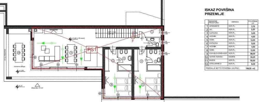 On the ground floor there is a living room with a dining room and a kitchen, a toilet, a storage room, two rooms with attached bathrooms and anterooms, and a covered terrace with access to the 50m2 swimming pool and sunbathing area.