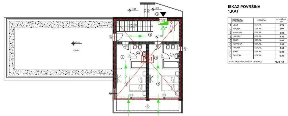 On the first floor, there is the main entrance to the house, a hallway and two bedrooms with attached bathrooms, an entrance hall and a balcony.