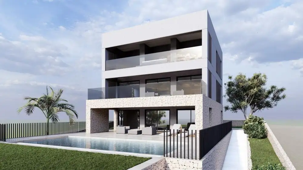 A fantastic modern family villa under construction in the Zadar area with a distant sea view. The total area is 330 sq.m, and the land plot is 700 sq.m. Essentially, this is a standalone elite residential building with a garage as an auxiliary structure and a swimming pool, consisting of three floors (ground floor + 2). The concept of the house features a cascading gradation of volumes, from the auxiliary building – the garage, through the "infinity" pool to the family home, designed in such a way that all living rooms offer a beautiful view of the sea. The floors are connected by an internal staircase. The first floor consists of an open-plan kitchen, dining room, and living room with a bathroom, which opens onto a partially covered terrace with an "infinity" pool and a sunbathing area, surrounded by a well-maintained garden. The second floor consists of three bedrooms with double beds, a walk-in closet, and separate bathrooms, each of which has access to a shared terrace with a wonderful sea view. The second floor features the master bedroom with a walk-in closet and bathroom, as well as a spa area that includes a mini-kitchen, sauna with a bath, and a jacuzzi on the open terrace. Parking is arranged with two parking spaces in the garage, with the possibility of parking several cars outdoors on the plot in front of the garage.