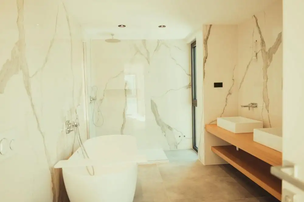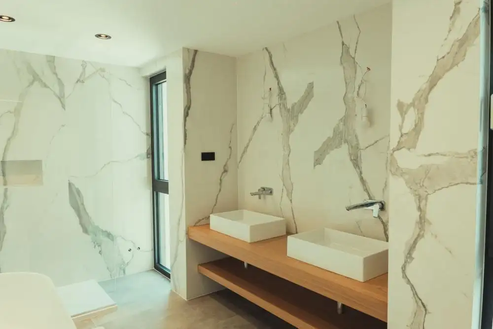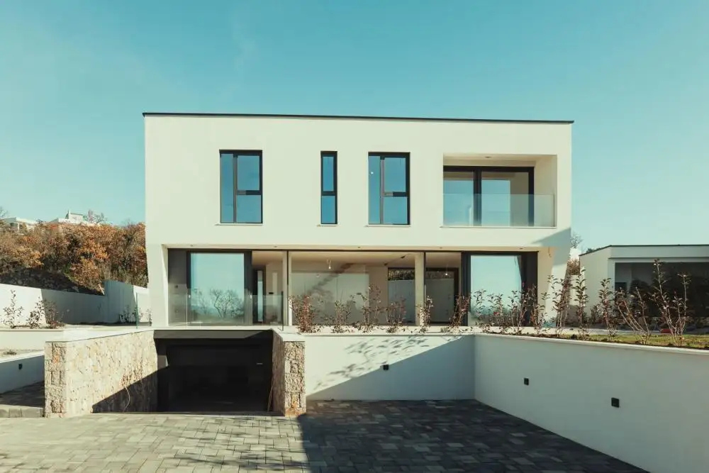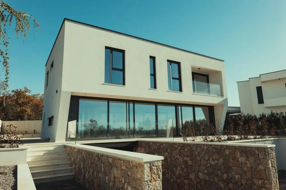 Externally, the villa exudes sophistication with Schuco system carpentry featuring safety low-e glass, Roltek electric blinds driven by state-of-the-art Somfy motors, and the added convenience of mosquito nets. A flat roof, ensconced in TPO foil, is complemented by insulation ranging from 16 to 26 cm, augmented by river stone for added insulation, and roof sheets crowned with gutters. The façade, resplendent in the STO system (STOSILCO K 2mm system), culminates in a polished finish.