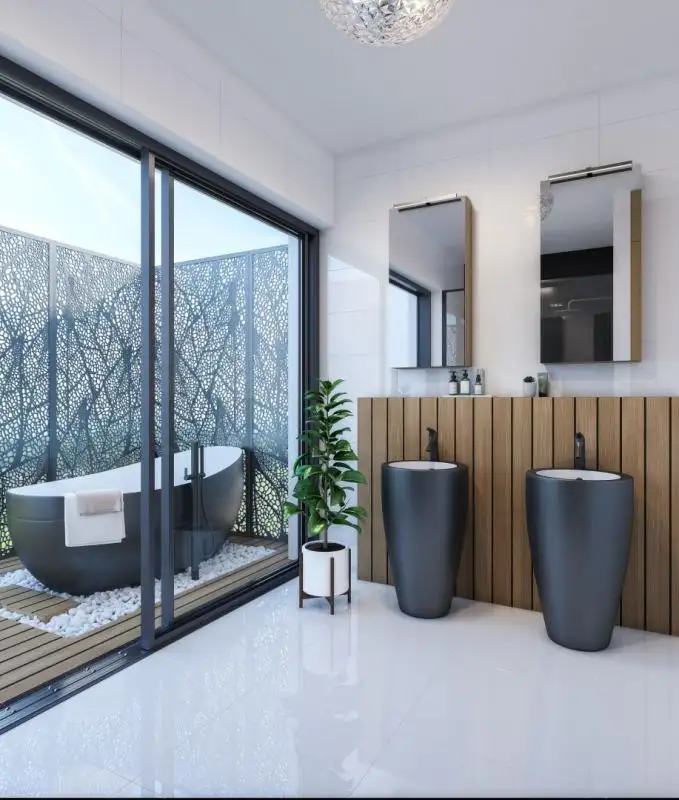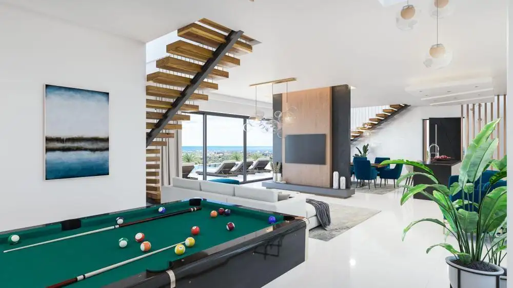 The infinity pool is the center of this modern villa, creating the illusion of merging the water with the sky or the sea in the distance. One of the walls of the pool is made of transparent glass, which creates a unique visual effect. Next to the pool itself, separated only by transparent glass, there is a fire pit, another enchanting addition that completes the ambience of the villa. The fire pit, located at the level of the pool, provides warmth and a romantic atmosphere, creating the perfect place to socialize and relax. In the evening, a flash of flame reflects off the glass wall of the pool, creating a play of light. For a complete experience, future owners will have the opportunity to relax in an elegant sauna with a starry sky or enjoy the intoxicating experience of an outdoor jacuzzi.