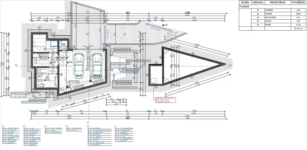Lowest level offers garage for 2 cars, technical spaces.