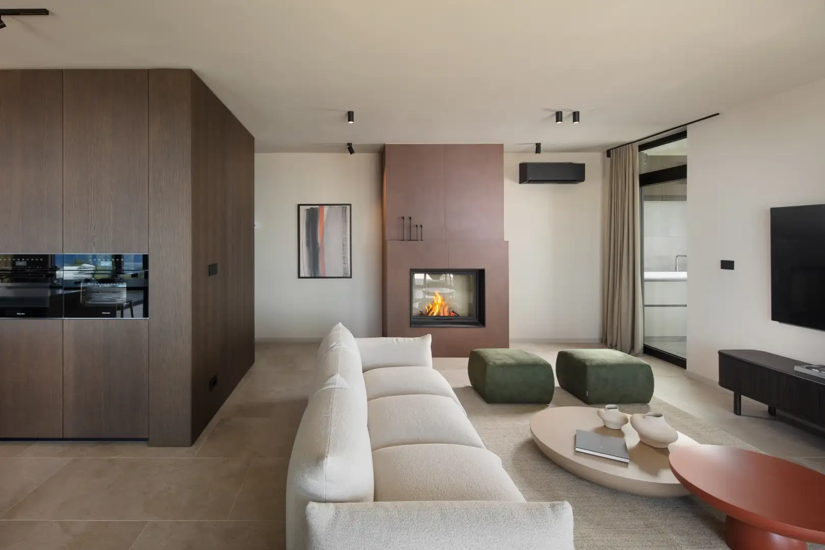 The interior occupies two floors with a functional and open layout, emphasizing practicality, spaciousness and light. It includes large glass walls, high-quality finishes and carefully selected modern furniture, creating an elegant and aesthetically pleasing atmosphere. On the ground floor there is an open space combining the kitchen, dining room and living room, which overlooks a covered terrace with a summer kitchen. There is also a recreation area with a sauna, hot tub, shower and guest toilet.