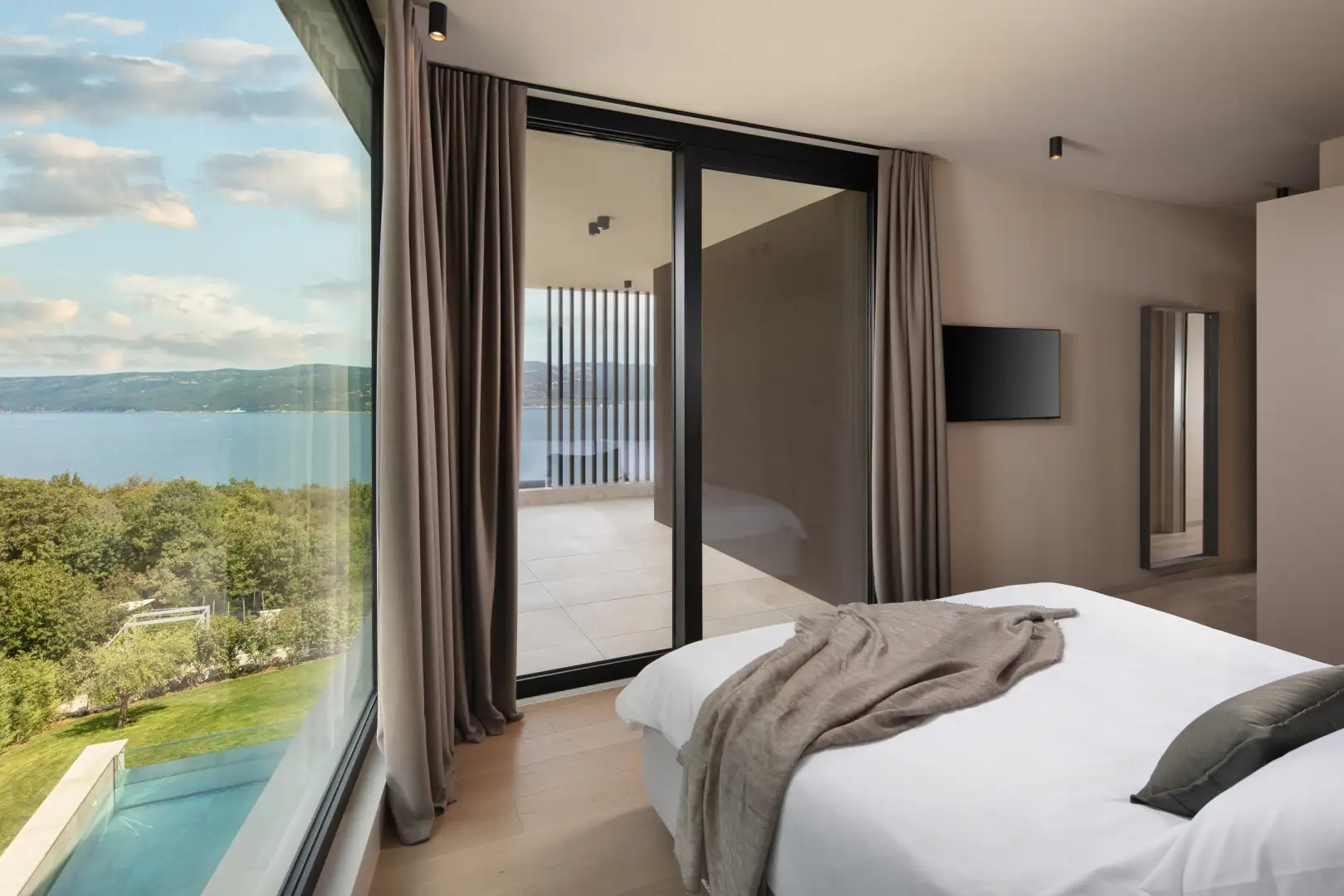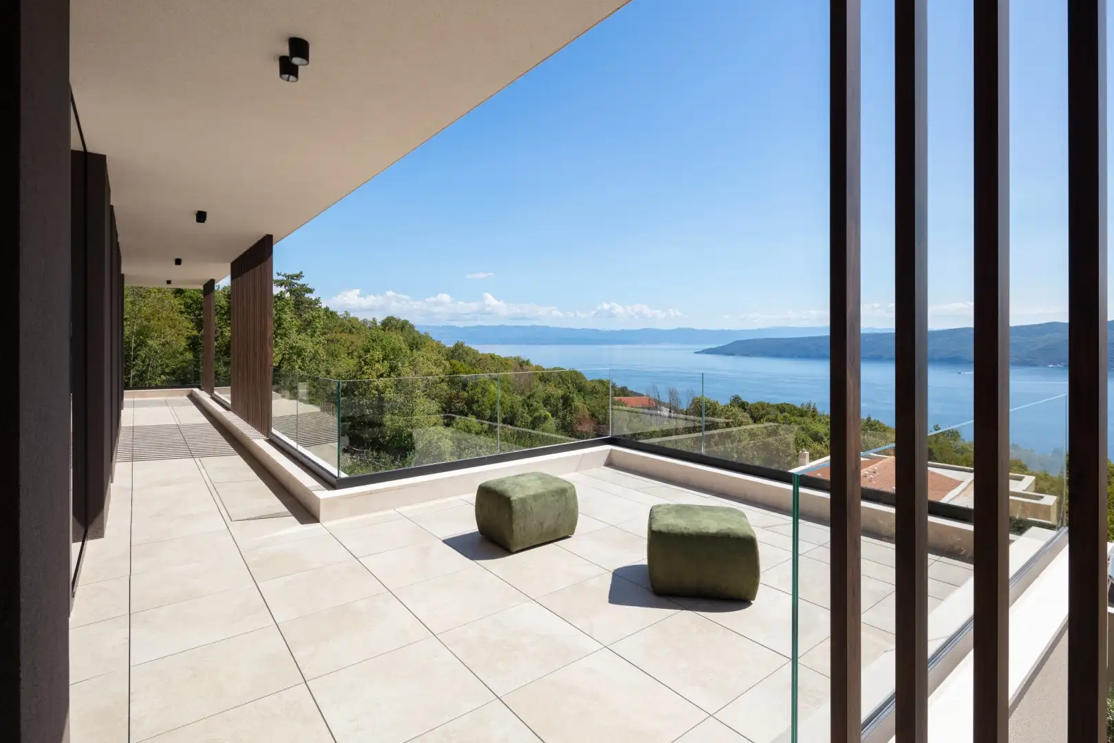 In the vicinity of Rabats and Labin, next to the fortified city on a hill overlooking the bluish-green bay and the entire Kvarner region, a luxury villa with a modern design and sea views is for sale.