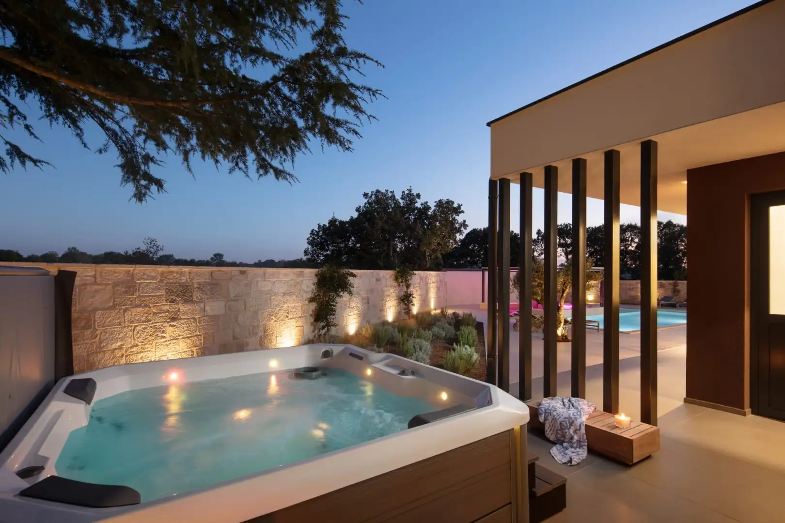 The exterior is also perfectly decorated. A heated L-shaped pool with a sun terrace, a jacuzzi on the terrace, an indoor outdoor living room and a summer kitchen with a grill and dining area under a pergola make this place ideal for relaxation and entertainment. The outdoor fireplace creates a warm, cozy atmosphere on cool evenings. There are also three private parking spaces and a charging station for electric vehicles.