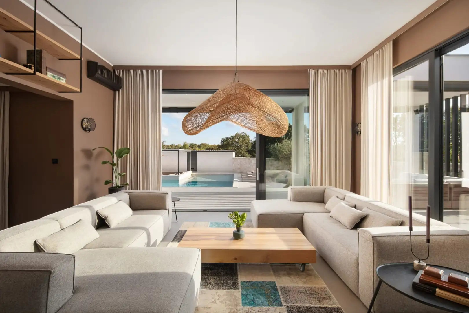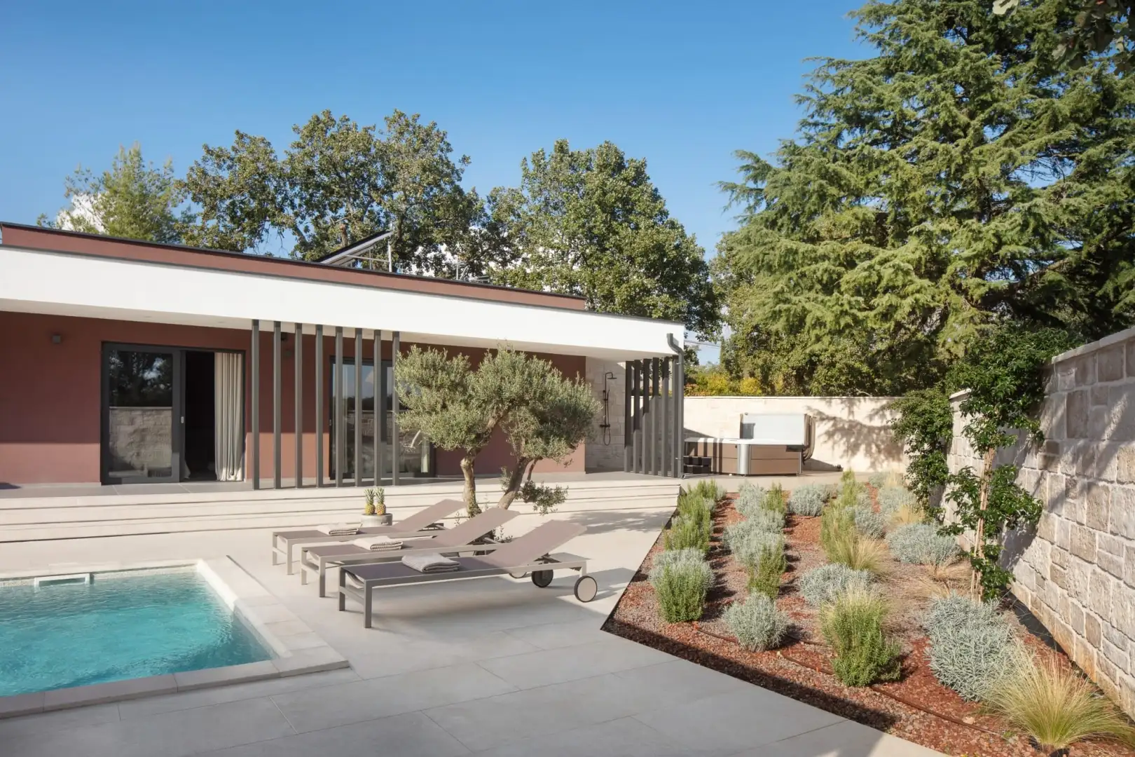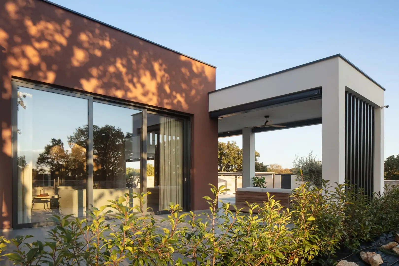 The villa is located on a plot of 954 square meters and offers 200 square meters of elegant one-storey living space. It is just a four-minute drive from the picturesque Lima Canal and is connected to Rovin by a 12-kilometer bike path built on the site of a former railway line - an ideal way to explore the surroundings in a calm and environmentally friendly environment. Inside the villa is designed with an open concept in mind. The spacious living room, dining room and fully equipped kitchen smoothly transition into each other in a bright, sun-drenched space with large sliding glass walls that open onto the luxurious terrace. This seamless transition between inner and outer space creates a natural connection to the environment.