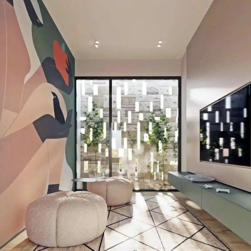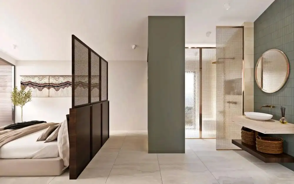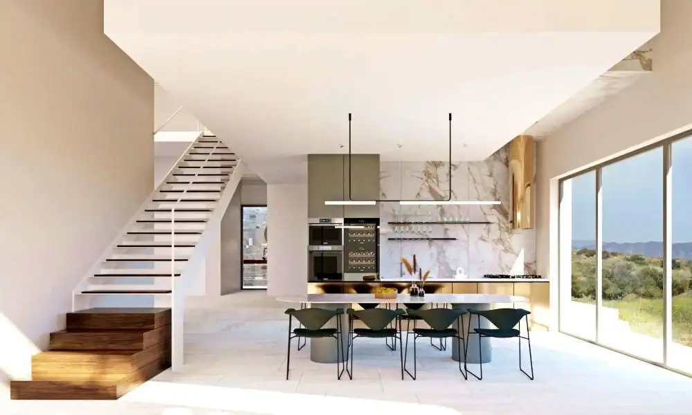 Aligned with its majestic architecture, the interior of this enchanting villa, bathed in natural light, stands out with top-notch equipment, natural materials, and earthy tones.