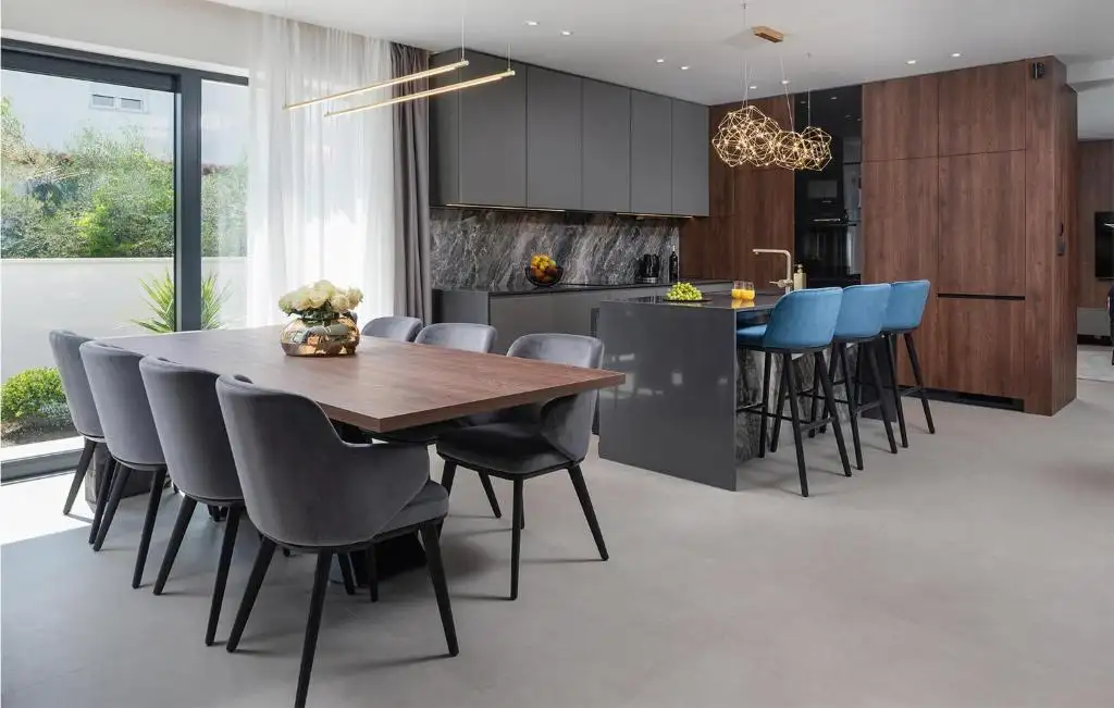 On the first floor there is a living room with a corner sofa, a double sofa, coffee table and TV, as well as a modern and fully equipped kitchen where you can easily prepare meals for the whole family and also includes a bar with 3 bar stools. The dining room has a dining table with seating for 8. Also in the project there is a game room on the first floor where you can have fun playing billiards, and the youngest ones will be pleased with the PlayStation game console.