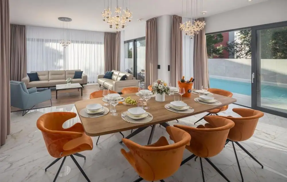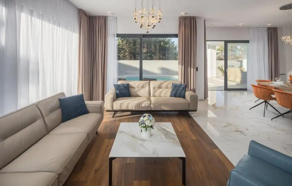 This exceptional villa offers the epitome of luxury and comfort. During construction, the owners spared no expense, utilizing the most modern materials and cutting-edge technology, including renowned brands like Miele and Swarovski. Each room features its own bathroom, while the kitchen is outfitted with state-of-the-art appliances. The dining and living areas seamlessly extend to an outdoor terrace featuring a heated pool and jacuzzi, ensuring year-round enjoyment.