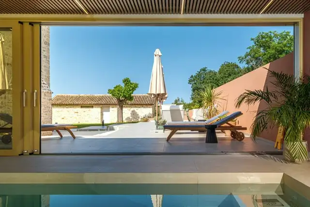 On the ground floor there is a cozy spa center with a fully equipped modern gym and an indoor heated pool. With sliding glass walls, the pool area can be transformed into a semi-enclosed space directly connected to the outdoor terrace, creating a smooth transition between the interior comfort and the surrounding Mediterranean landscape. This makes the villa ideal for relaxing, wellness, living outdoors and meeting with friends.
