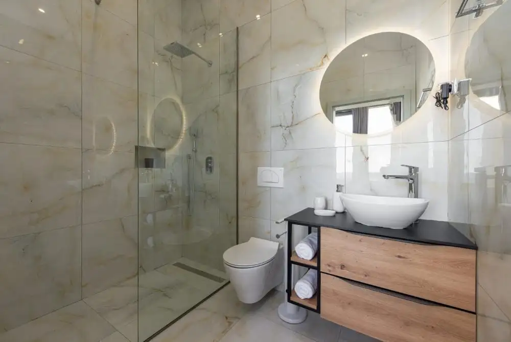 The second house is designed as a three-room apartment with a kitchen and living room, two bathrooms with access to a private terrace with a swimming pool and a barbecue area. Next to the house we have a tennis court and an auxiliary facility.