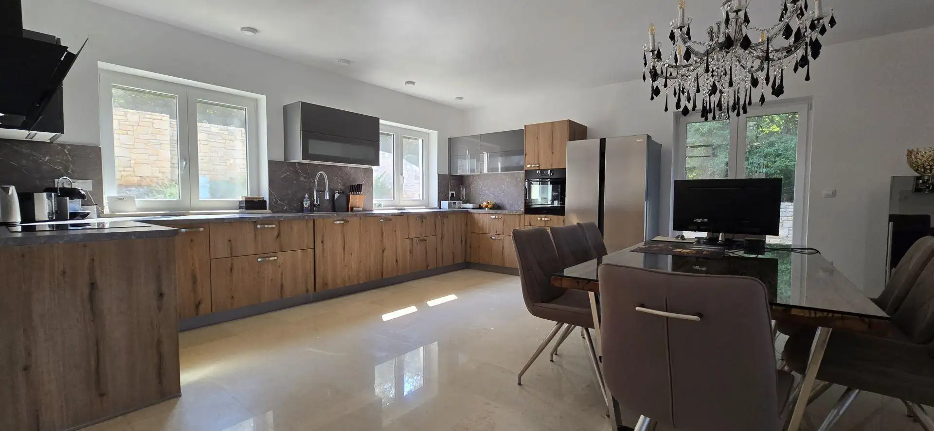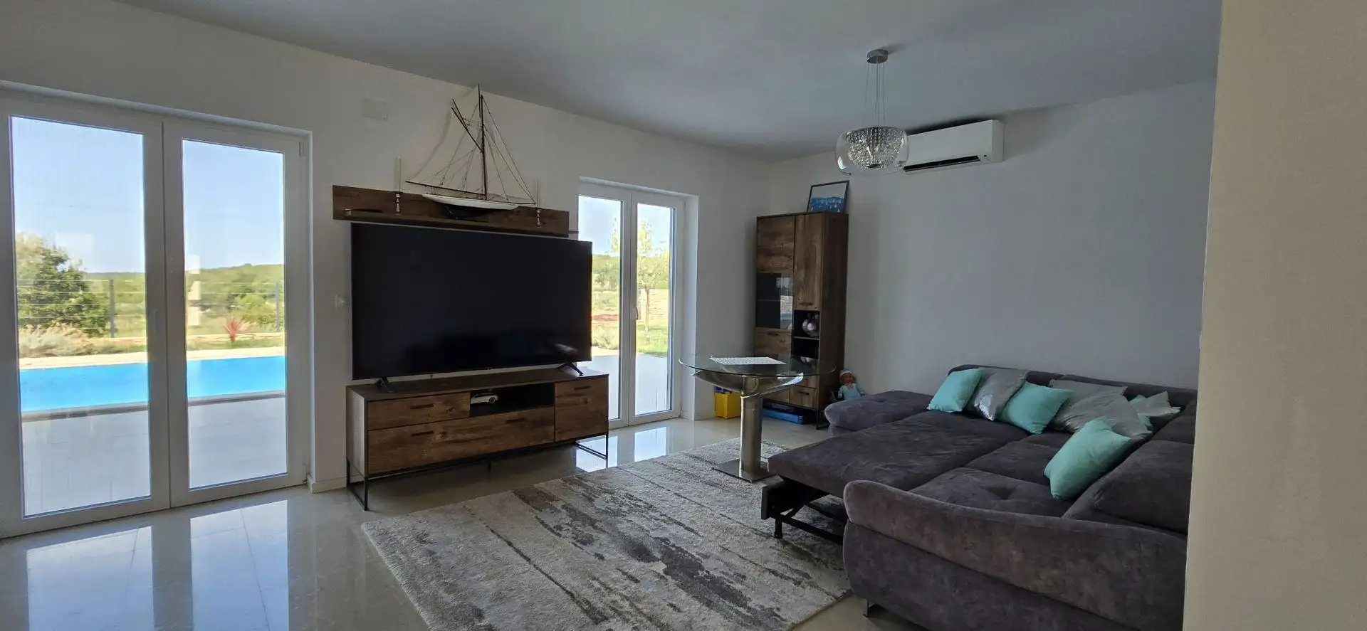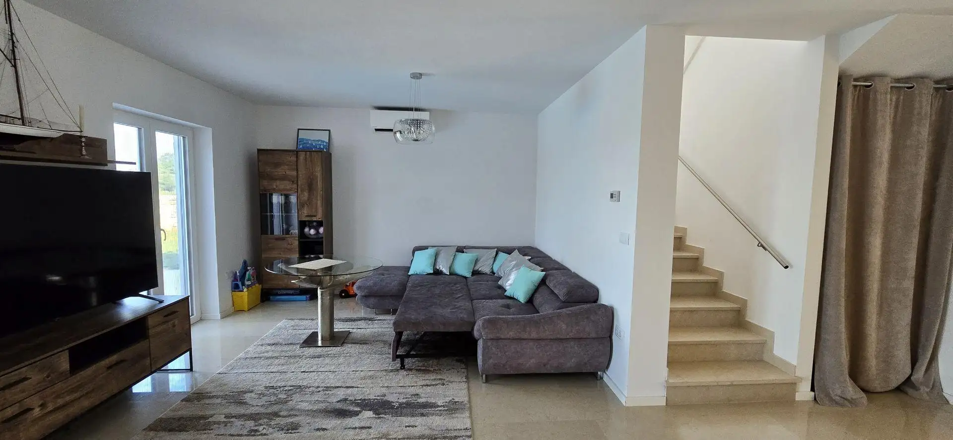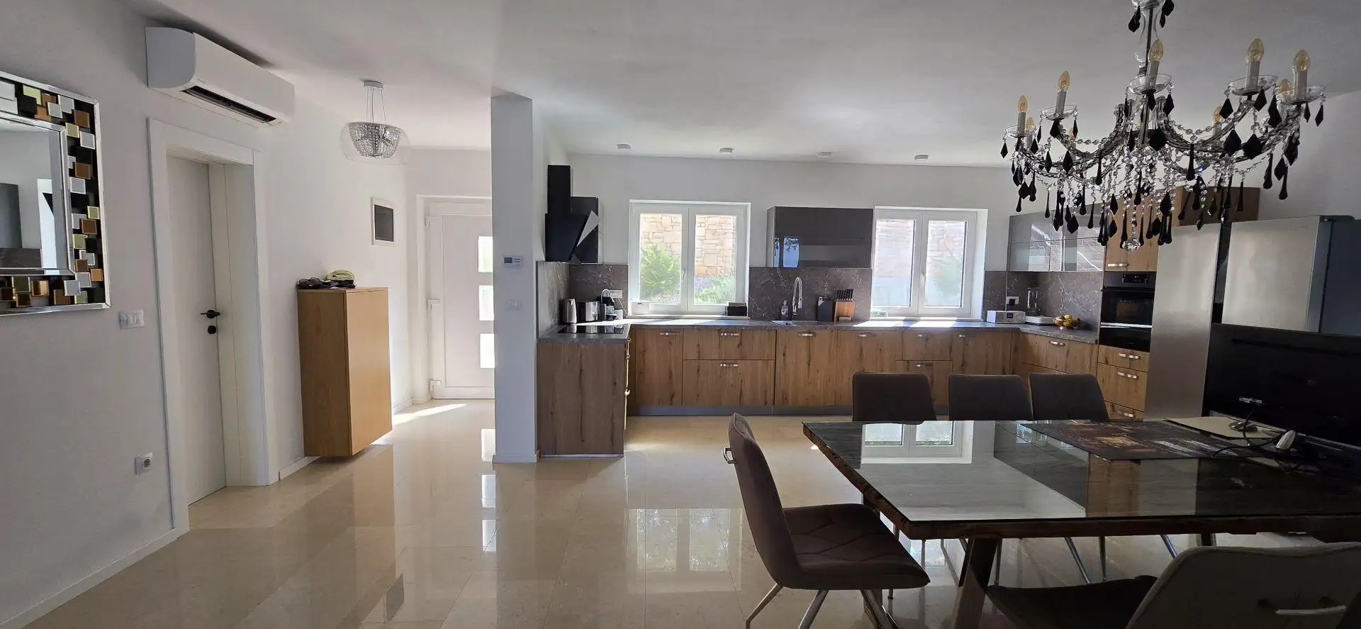 Built in 2020, the house is fully equipped and sold as is. It features underfloor heating with a heat pump and air conditioning.