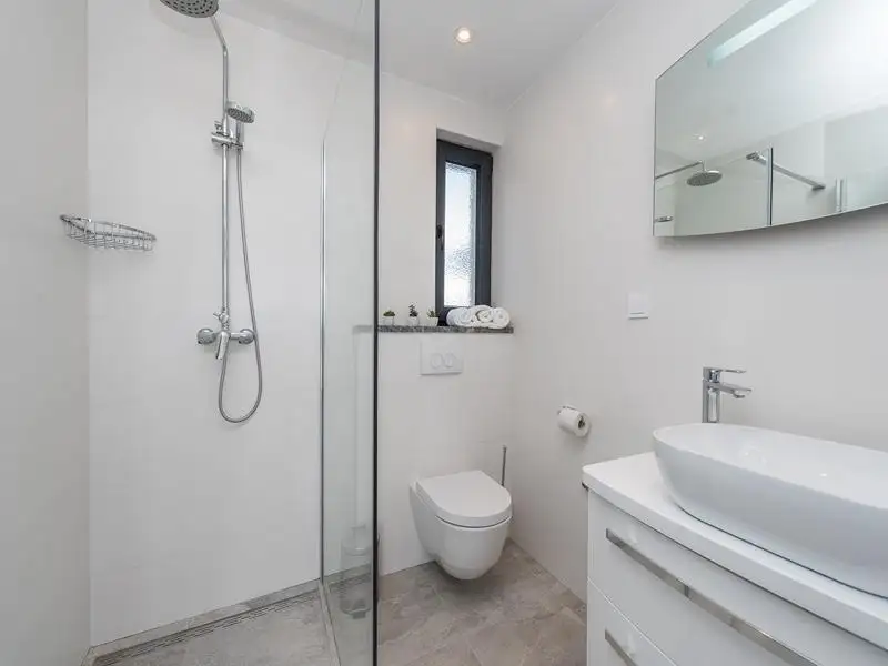 On the first floor, there is a spacious kitchen with all appliances and equipment, a dining room with direct access to the terrace, a living room with a modern fireplace, and a bathroom. On the terrace in front of the lounge area, there is a 6 x 4.5 m pool with anatomical sun loungers and an outdoor shower. The mezzanine features a wellness oasis SPA of 30 sq.m., equipped with a hot tub, infrared sauna, shower, and relaxation loungers, offering views of the sea and Mount Velebit. The atmosphere is enhanced by a ceiling designed to resemble a starry sky and a dome over the whirlpool.