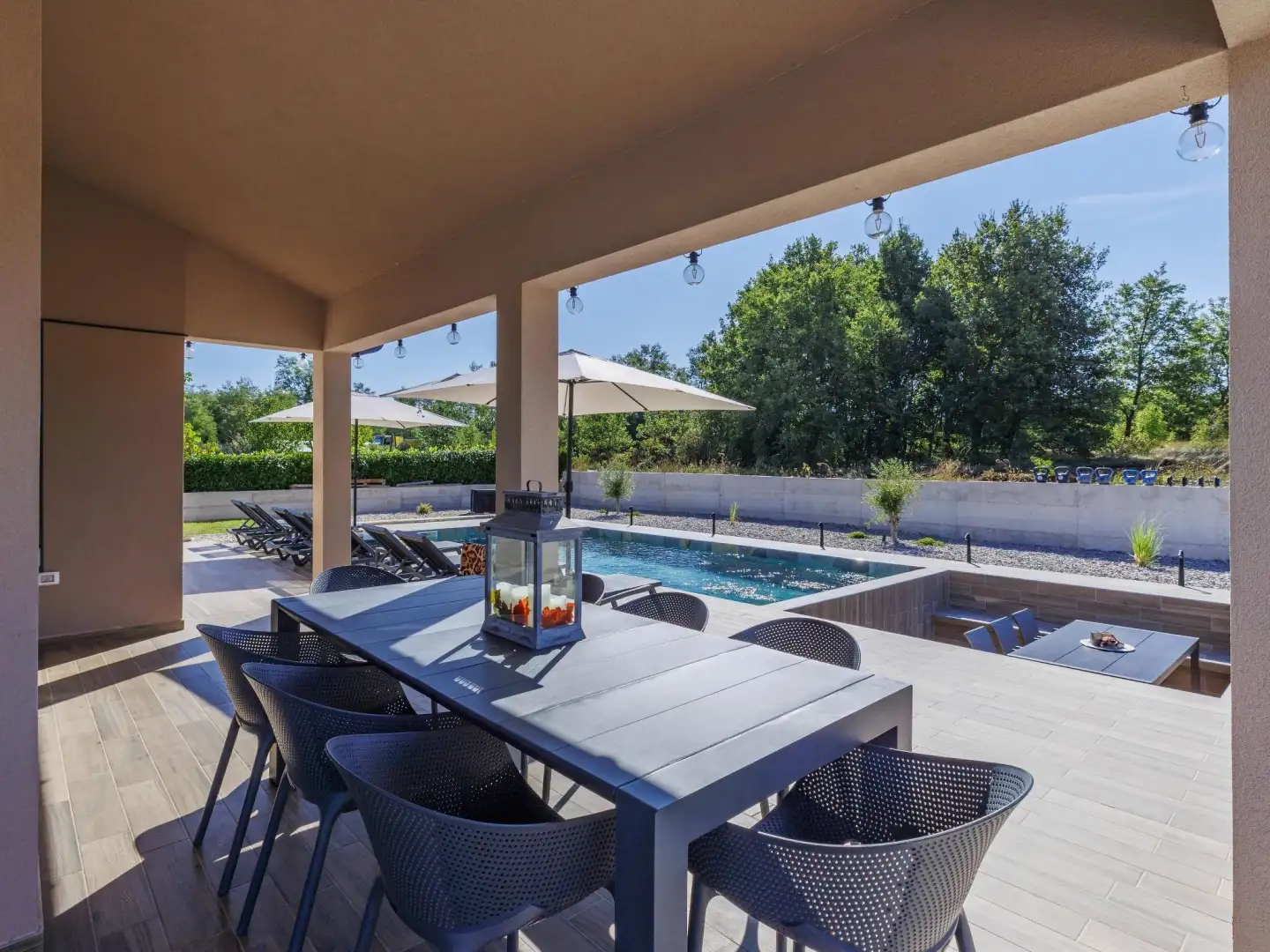 House with swimming pool for sale in the Labina area, located 9 km from the sea, offering a total living area of 188 m2 on a spacious plot of 1,207 m2. Located on the southeastern coast of Istria, where the green hills merge with the Adriatic Sea, this property occupies a unique position next to the historic town of Labin, just a short drive from the snow-white pebble beaches of Rabza. Labine is known for its rich history, artistic atmosphere and charming contrast between old and modern influences, making this area very attractive for both life and tourism. The new house is located in a quiet village surrounded by nature, family homes and resort facilities, providing privacy while remaining close to the necessary amenities. Designed as a single residential property on two floors, the house has a bright and spacious interior, filled with natural light and made to a high building standard. On the first floor there is an open living room, dining room and kitchen with direct access to the covered terrace, as well as one bedroom, study, bathroom and technical or storage room. On the second floor there are three comfortable bedrooms, two bathrooms and a terrace shaded with pergola.