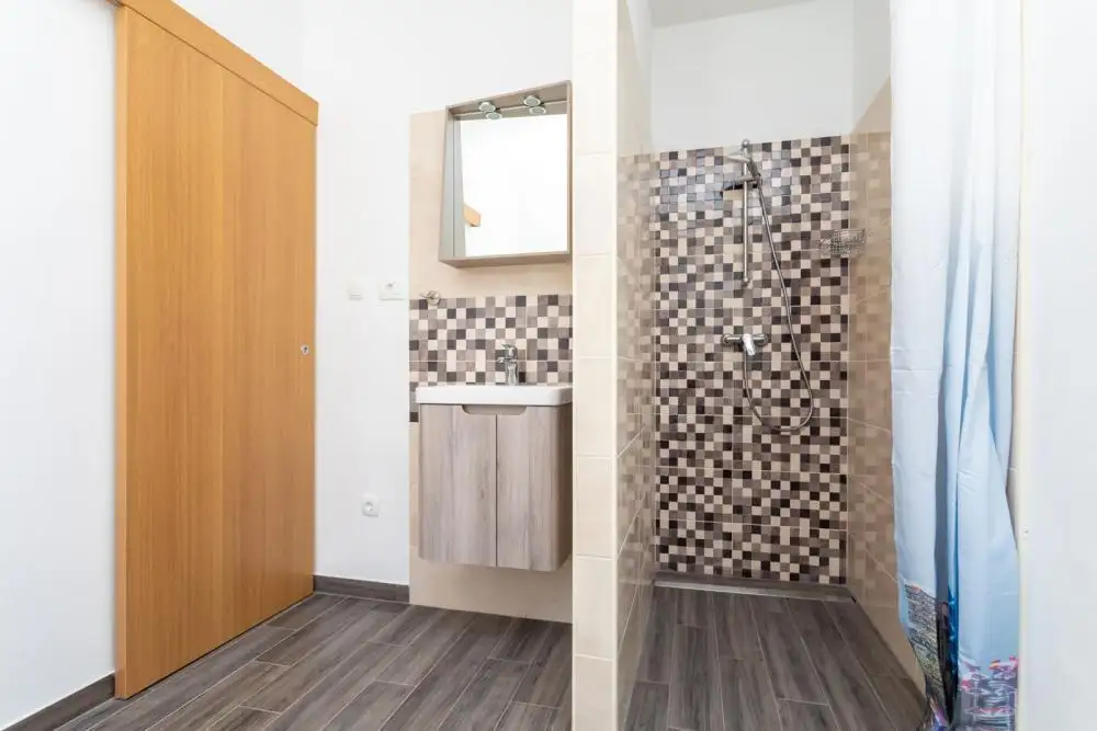 Upstairs there are two more bedrooms and a living room, which can be converted into another bedroom, bathroom, summer kitchen and terrace with sea views. The ground floor level overlooks a covered terrace with a barbecue, next to a swimming pool with a solarium. The house is fully furnished and equipped and sold as such, ready for private residence or rent. The biggest advantage of this house is the location because it is only 100 meters from the sea. Unique property!