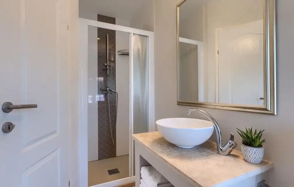 An internal staircase leads to the first floor of the villa, where there are two furnished bedrooms, both with their own bathrooms.