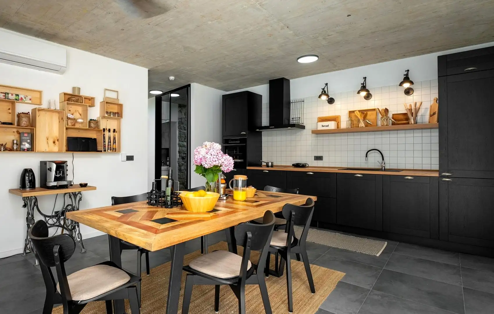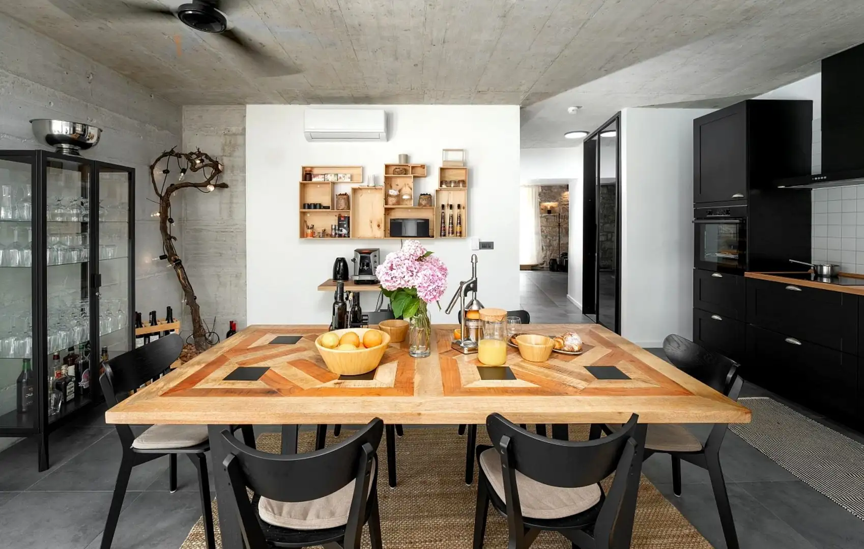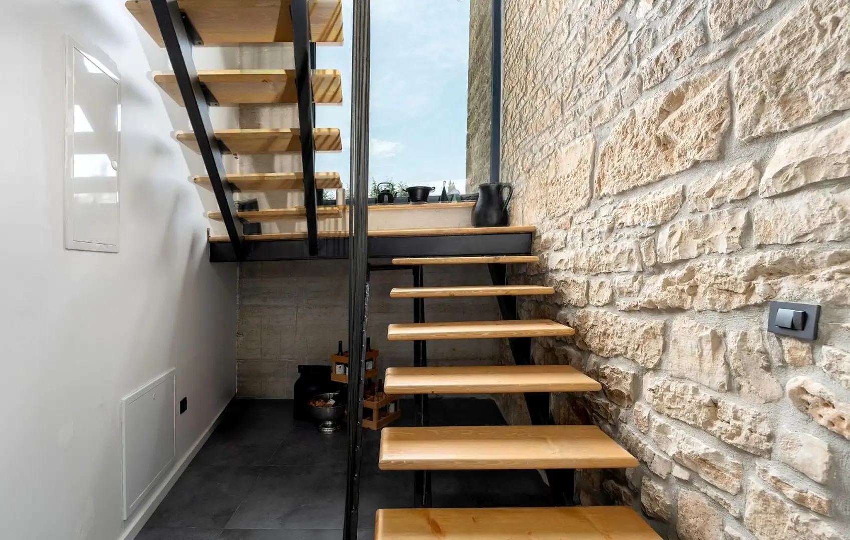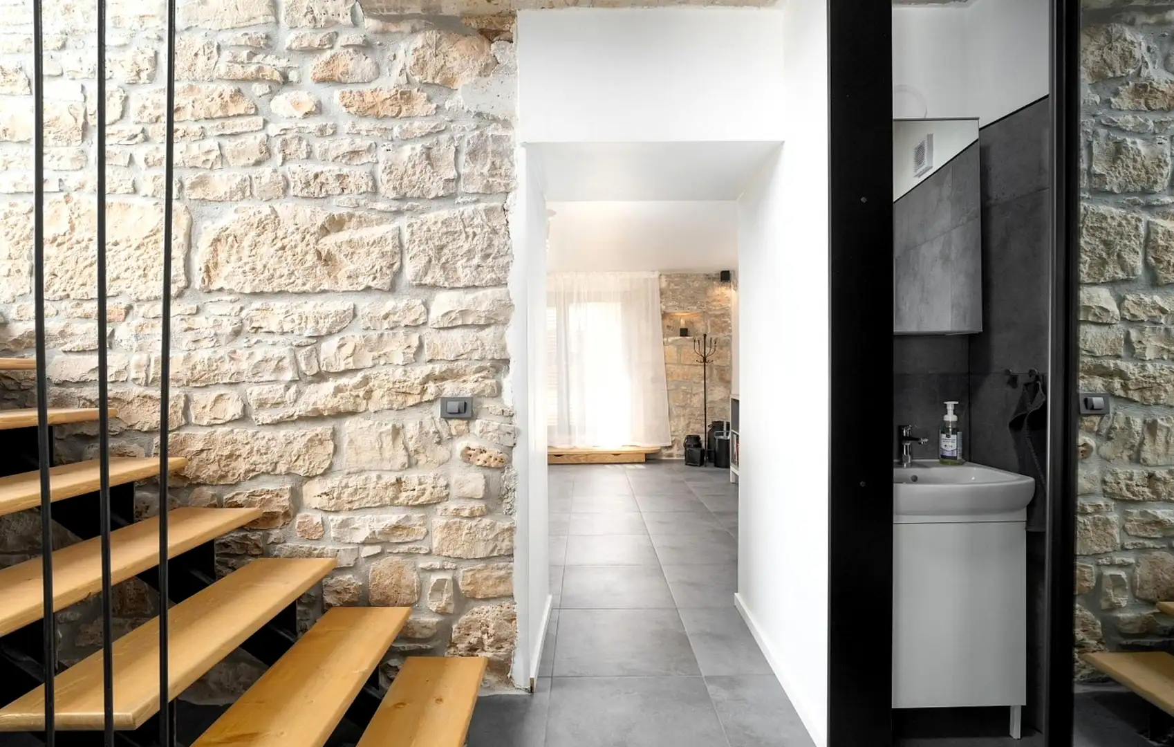 The house respects the architectural heritage of the region while embracing contemporary design and comfort. What was once a dilapidated traditional stone house has been transformed into a fully functional and aesthetically exquisite semi-duplex dwelling, which harmoniously fits into the surrounding nature. Located on two levels, the ground floor includes a bright living room, a fully equipped kitchen with a dining area and access to a covered terrace with a summer kitchen and a guest toilet. On the second floor there are two spacious bedrooms, each with a separate bathroom, which provides a high level of privacy and comfort.