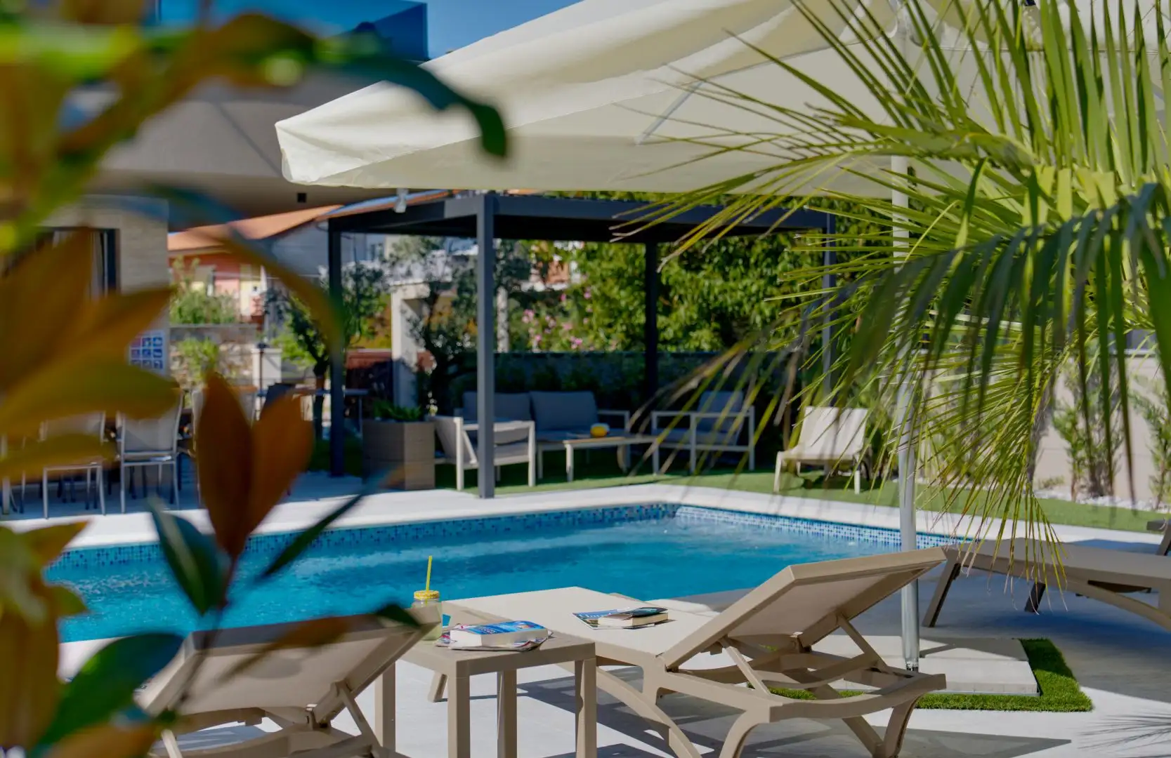 On the first floor there is a spacious living room, kitchen with dining area, a utility room and two large covered terraces that provide access to the outdoor kitchen, swimming pool, barbecue area, guest toilet and boiler room. On the second floor you will find four beautiful bedrooms, each of which has its own bathroom, as well as additional space in the attic for storage or other needs.