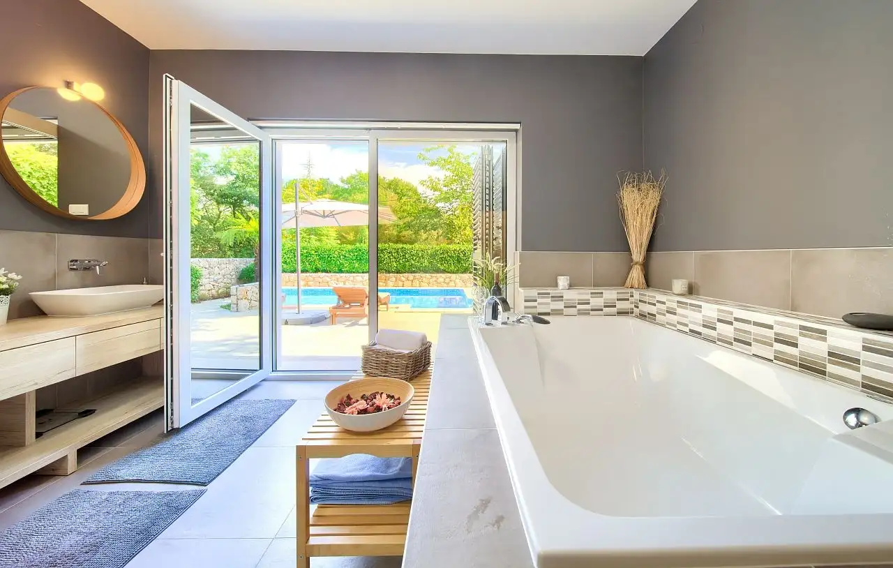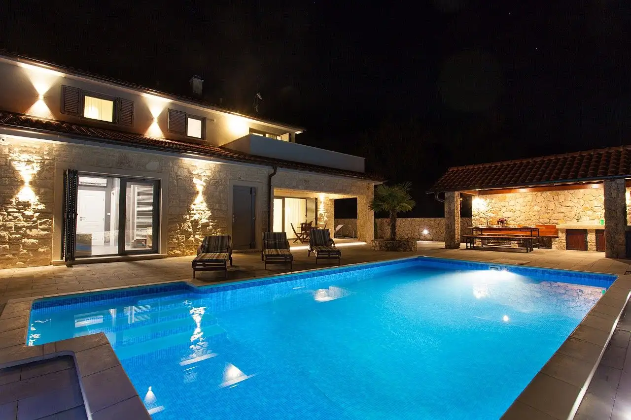 On the top floor there are three comfortable bedrooms and two modern bathrooms, completing the layout of the house. The villa is fully equipped with high quality materials, including premium ceramic tiles, high quality plumbing and PVC windows. Heating and cooling are provided by a heat pump system with eight fan coils, and solar panels provide hot water. The house has a 22 kW electricity connection and includes a charging station for electric vehicles. The indoor fireplace is integrated with the heat pump to support the heating of the whole house, and both the climate system and the heated outdoor pool are controlled remotely through a mobile application. Additional features include a street grill, irrigation system, full illumination of the outside area and garden, video surveillance, alarm system and rainwater tank with a capacity of about 50 cubic meters.