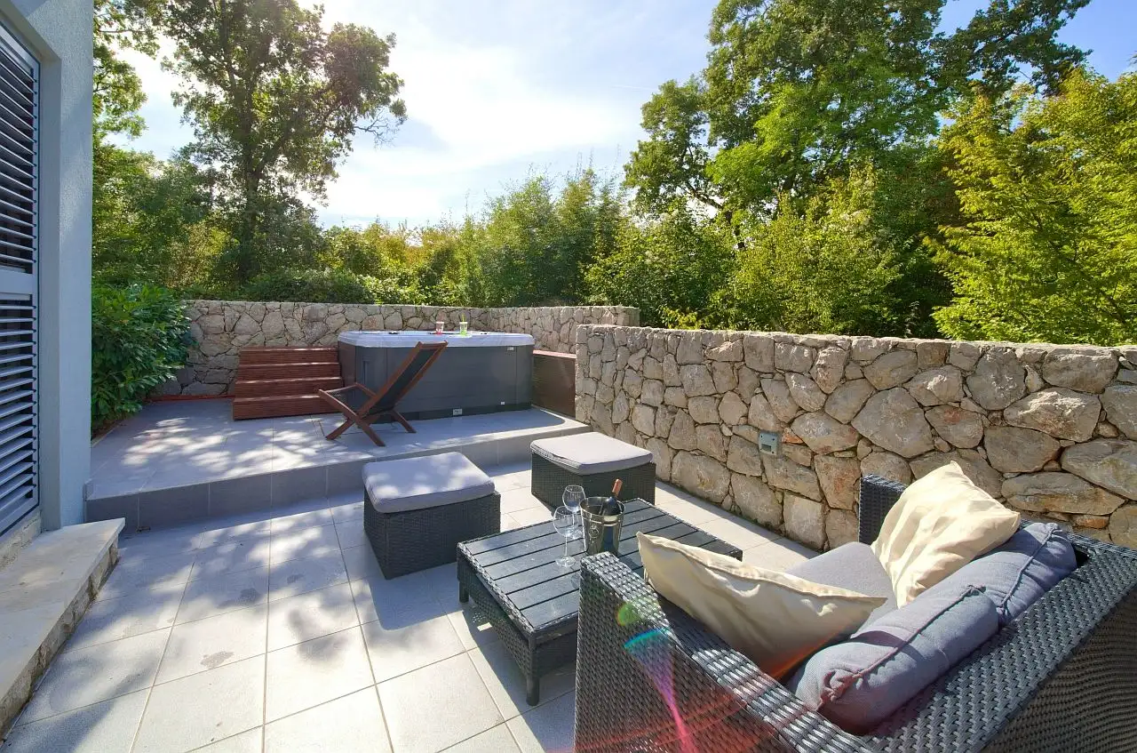 On the first floor there is a hallway that leads to a mini wellness zone equipped with a sauna and a jacuzzi. At this level there is one bedroom, as well as an open living room, which includes a kitchen, dining area and a living room overlooking a spacious terrace. There is also a laundry and boiler room on the ground floor for convenience.