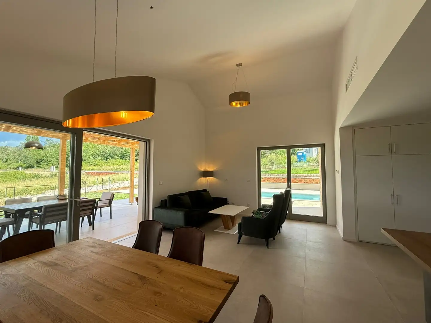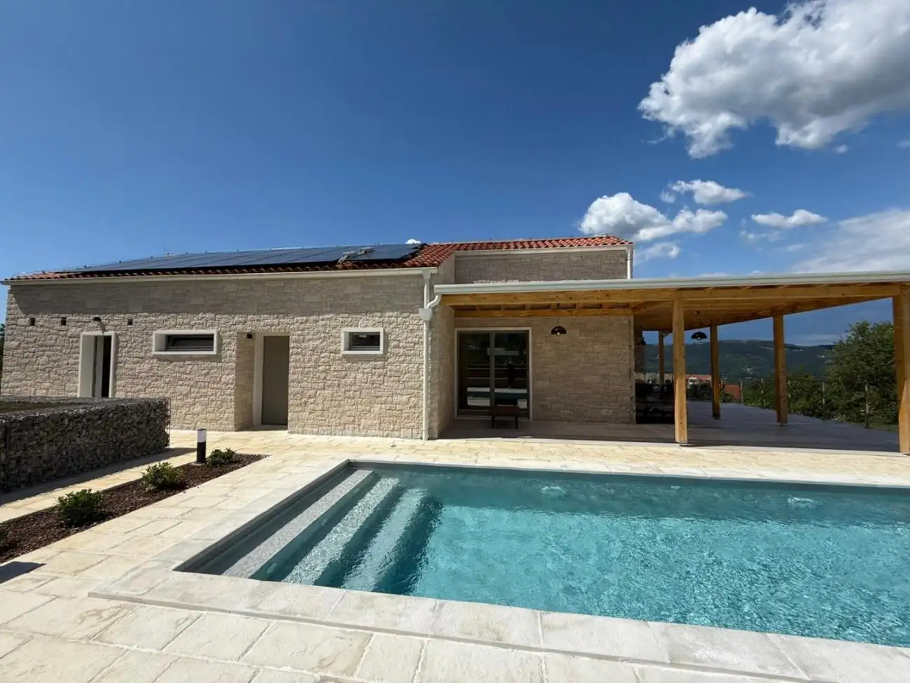 Not far from Motovun is for sale a harmonious new villa with a swimming pool. The villa offers a total living area of 158 sq.m. on a land plot of 875 sq.m. This property combines space, functionality, design and beauty in a perfect balance. The design and color palette of the house fit naturally into the surrounding settlement and landscape, reimagining traditional architecture in a modern way using local natural materials such as stone and wood. Built to high EU standards, the villa is also equipped with energy-efficient solutions, including solar panels as standard. The first floor is designed with simple, harmonious proportions and includes an open living room, dining room and kitchen, which overlook a spacious veranda covered with pergola. The layout also includes two bedrooms with separate bathrooms, a laundry room with a toilet and a technical / storage room.