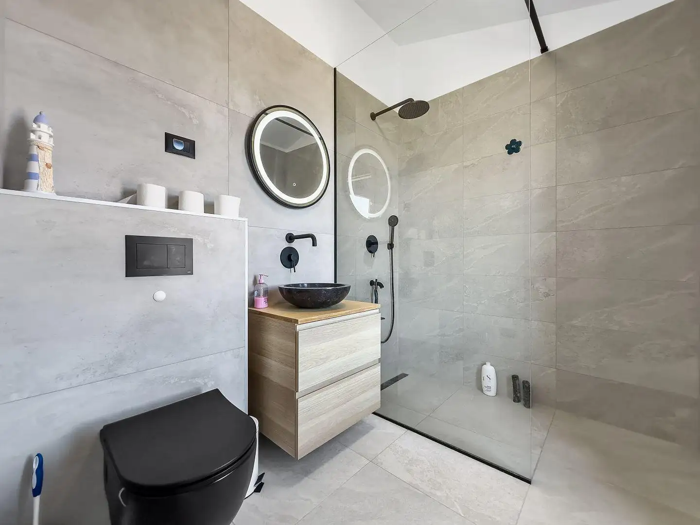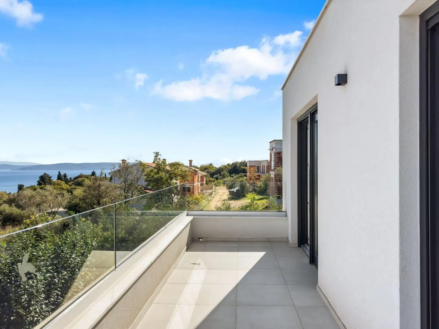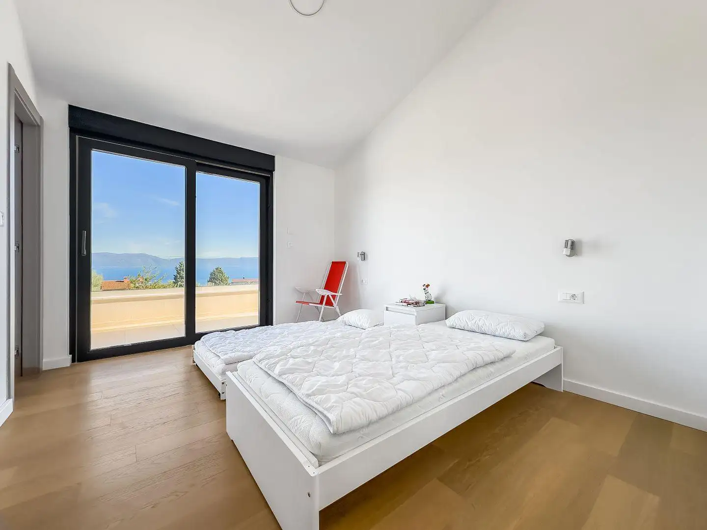Ascending the internal staircase, we arrive on the first floor, where three comfortable, contemporary bedrooms await. Each room boasts its own private en-suite bathroom, ensuring complete privacy for all residents. The bedrooms open onto generous balconies, where you can enjoy unobstructed views of the Adriatic Sea and its tranquil islands.