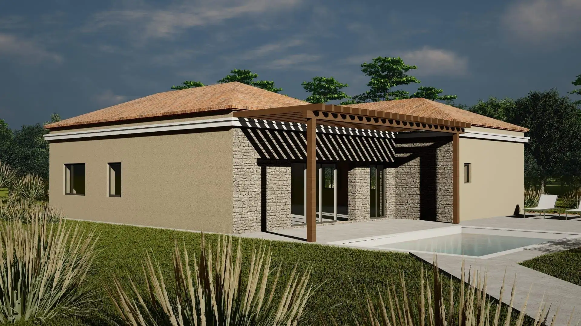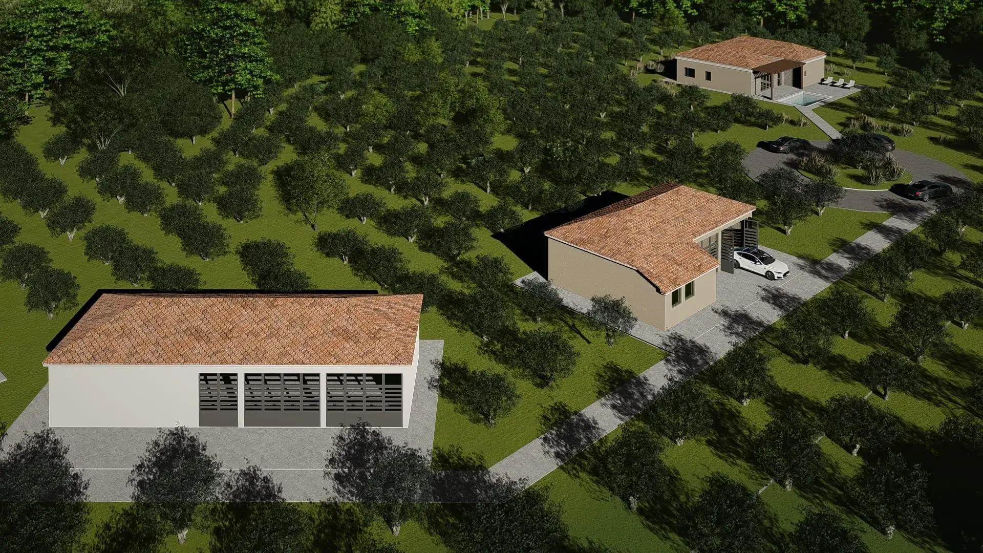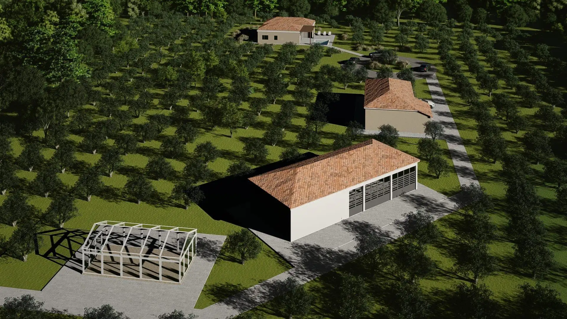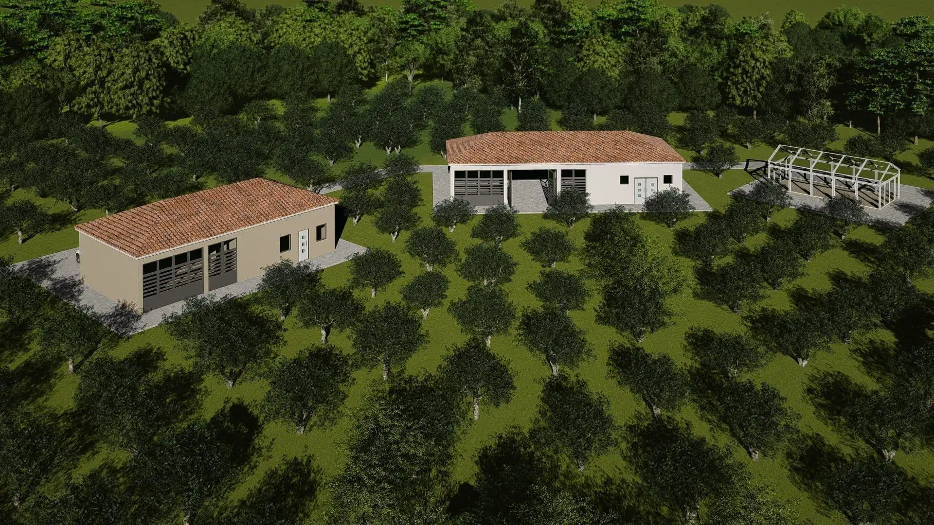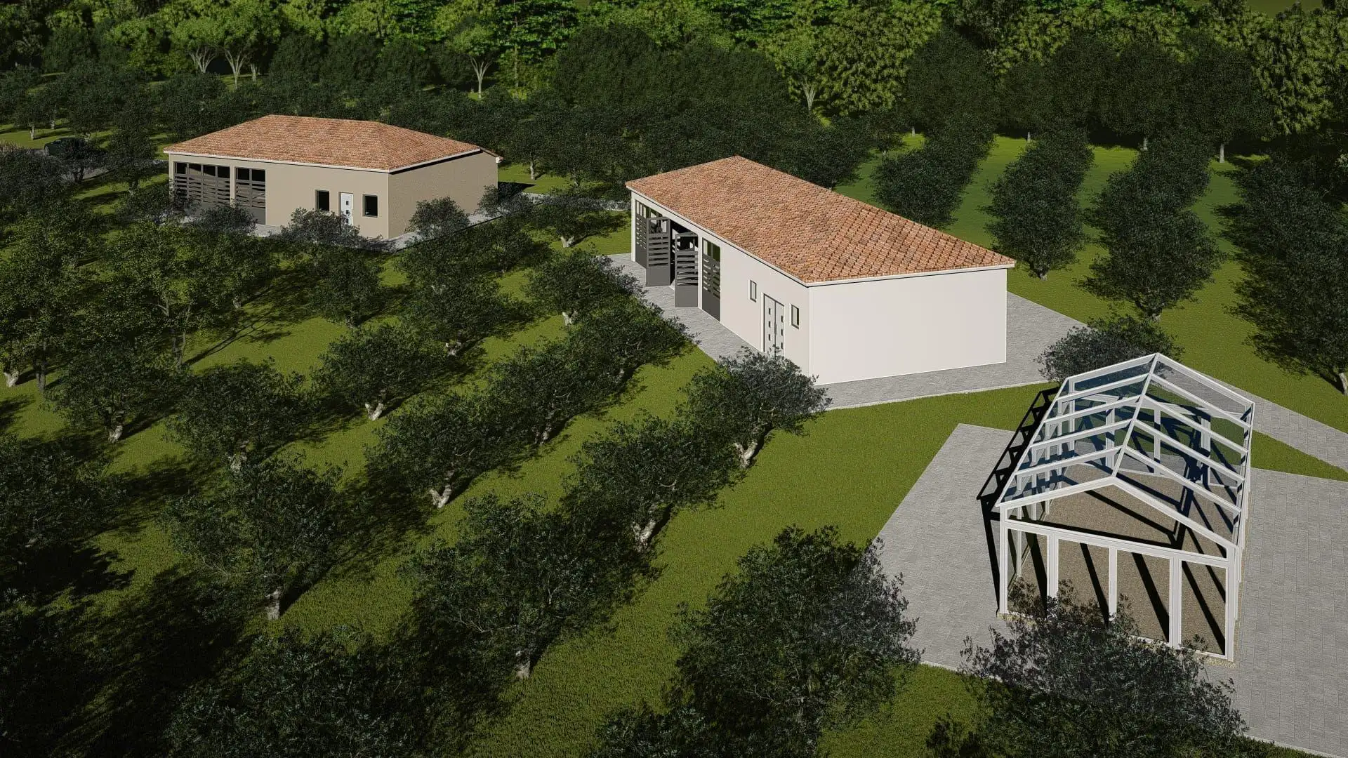 - Phase 1: House of 200 m², Building 1 (greenhouse of 50 m²), Building 2A.