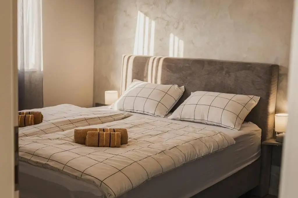 On the first floor, there are two apartments, each opening onto a landscaped yard with a pool. Both first-floor apartments feature an open-plan living room with a kitchen and dining area, a bathroom, a spacious bedroom, and a terrace overlooking the pool and garden. The sizes of these apartments are 46 m² and 65 m², and they are equipped with electric underfloor heating in the bathrooms and inverter air conditioning.