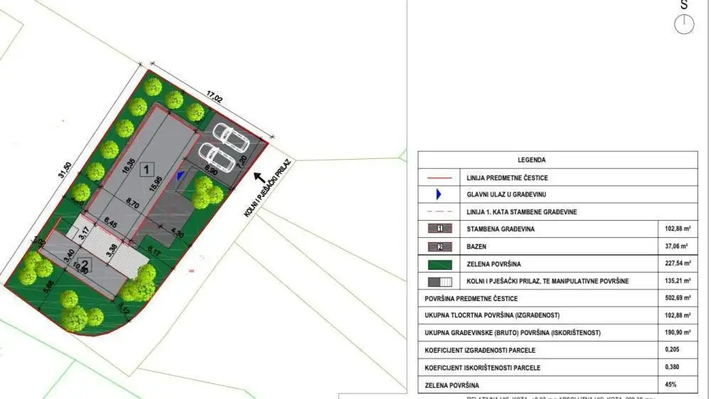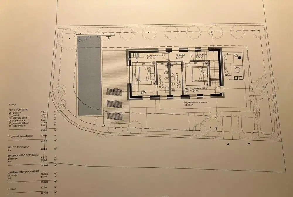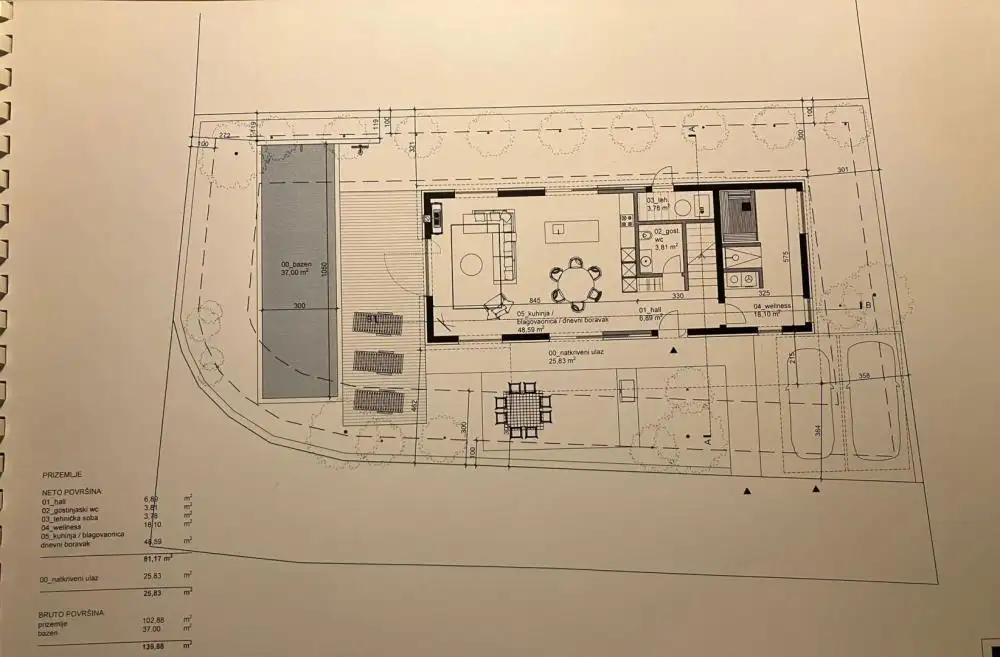 The total built area of the villa is 241 m2, of which the interior is 145 m2, the terrace 59 m2 and the outdoor swimming pool of 37 m2.