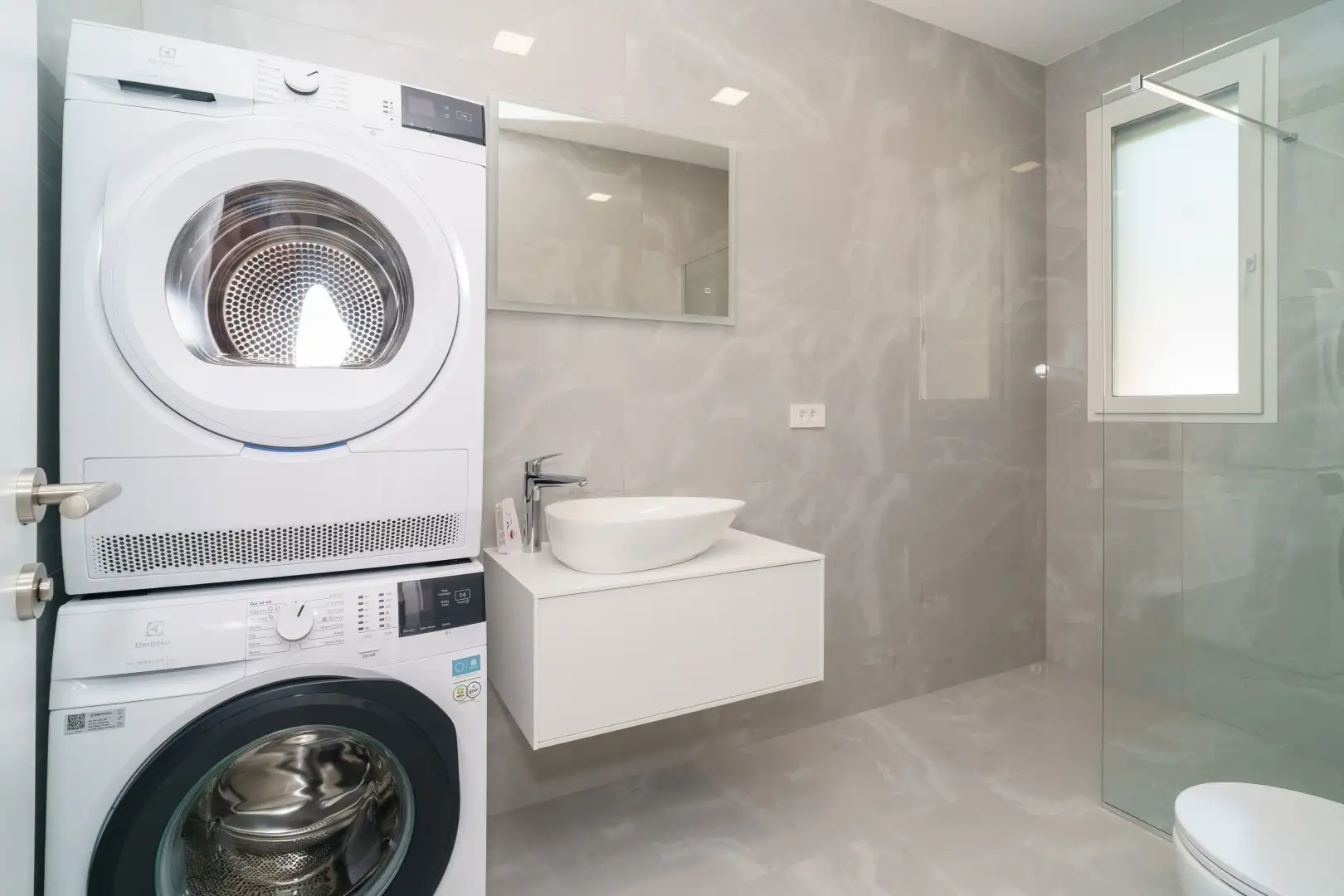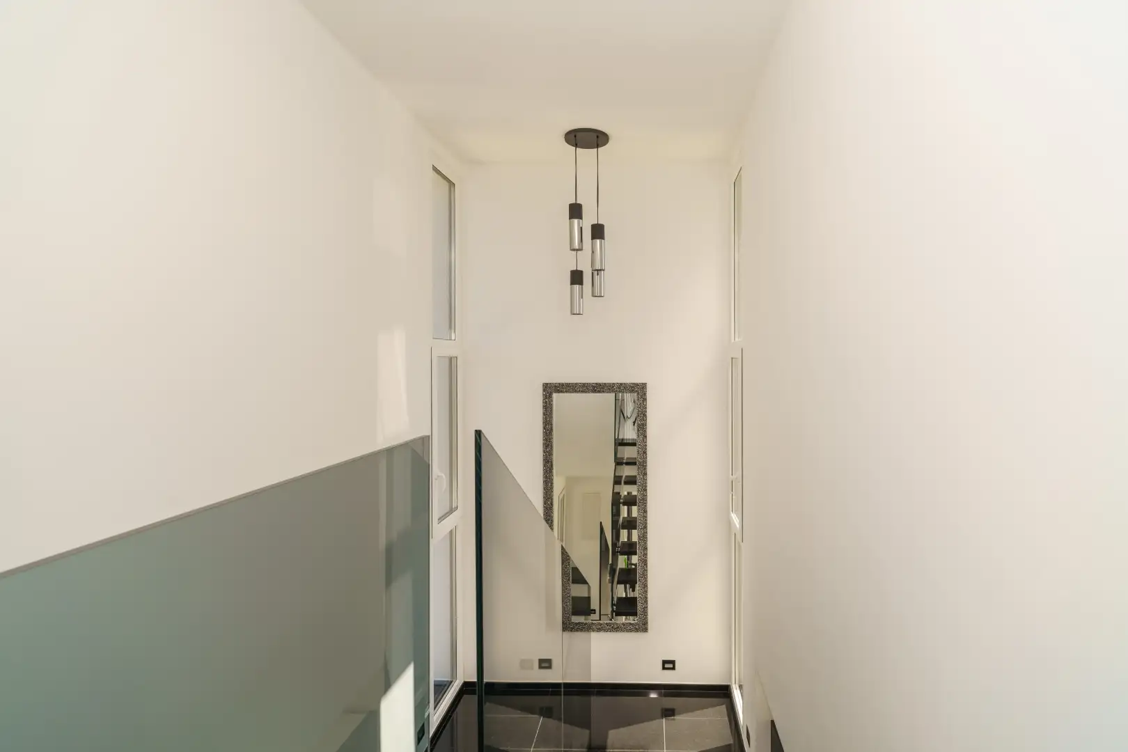 The first floor serves as the main living area and includes an entrance hall, an open kitchen with a dining area, a bright living room and a bathroom. Large glass surfaces provide natural light and offer direct access to the covered terrace from each part of the first floor, creating a smooth transition between the interior and exterior spaces.