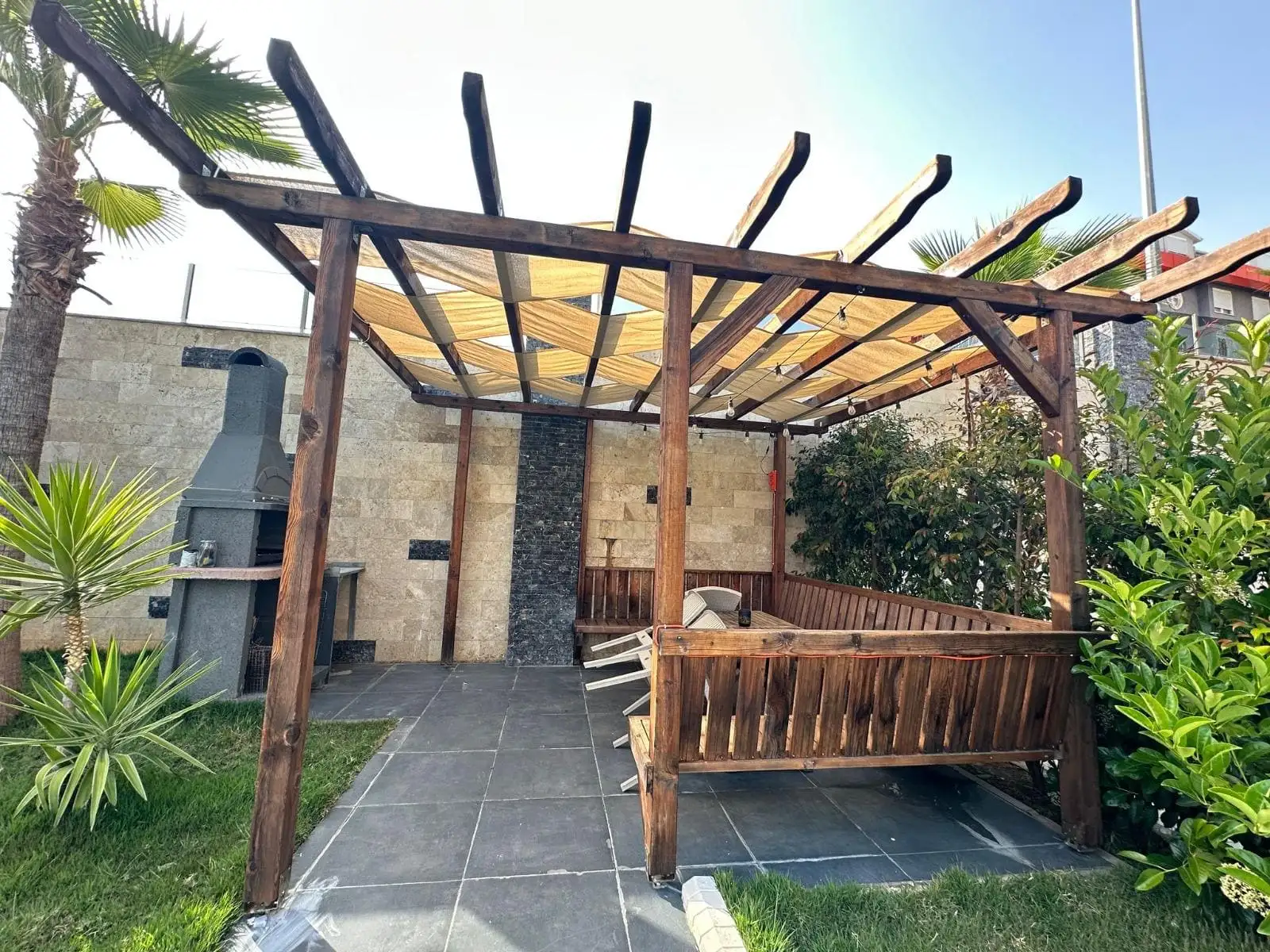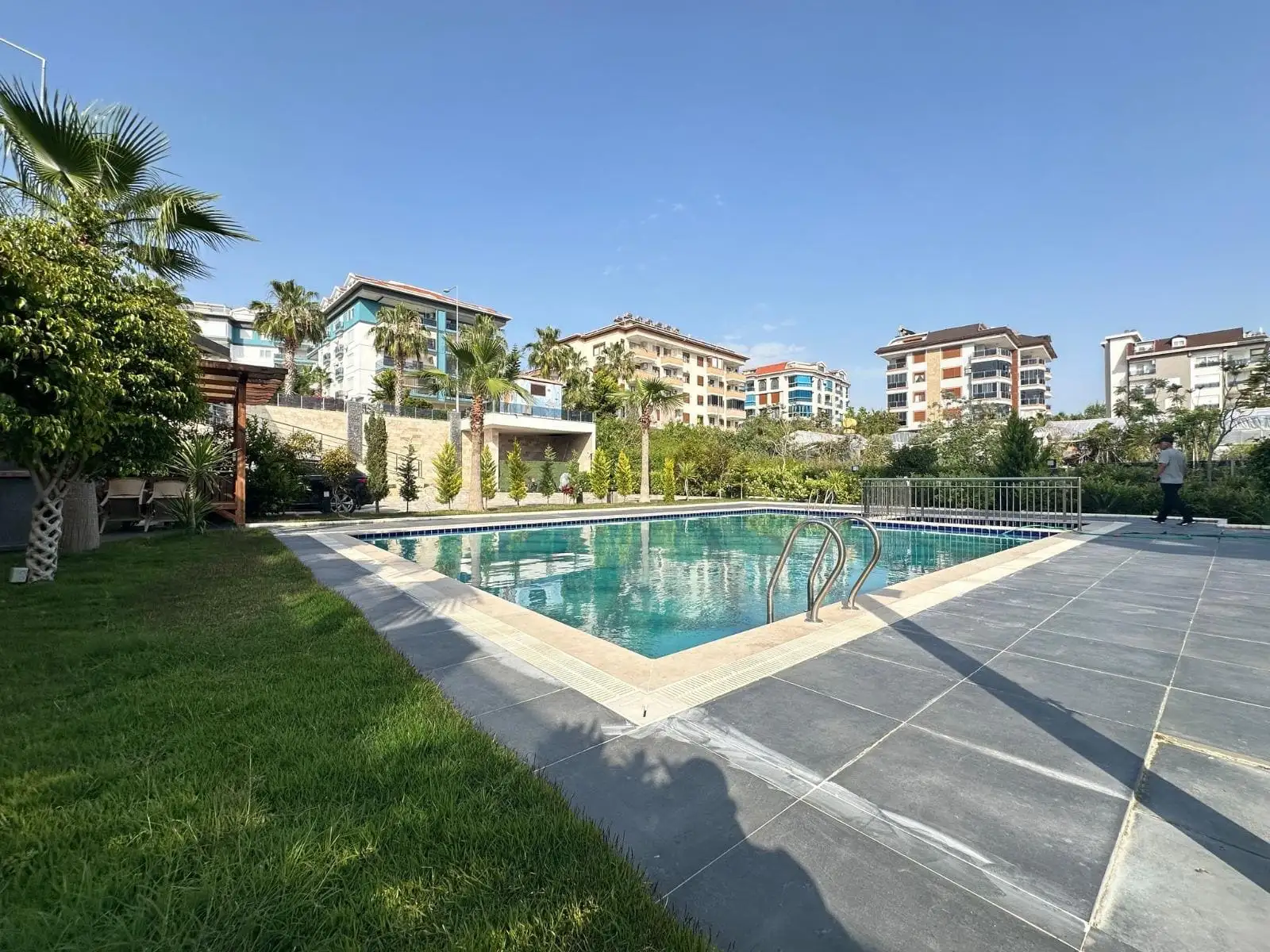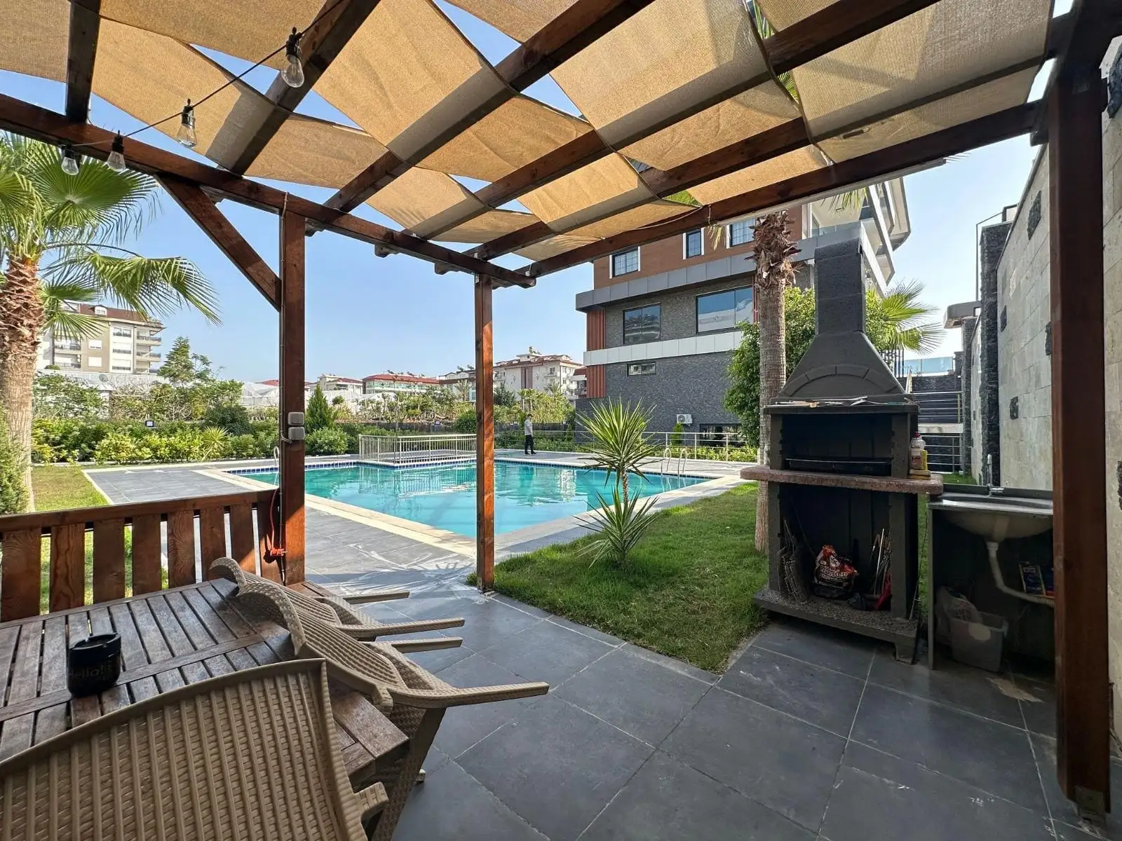 What is in the complex: A small neat complex with well-groomed green territory and all conditions for a comfortable life: an outdoor pool, a hammam, a sauna, a barbecue area, a generator, a garden, caretaker services. Everything works and is maintained in good condition.