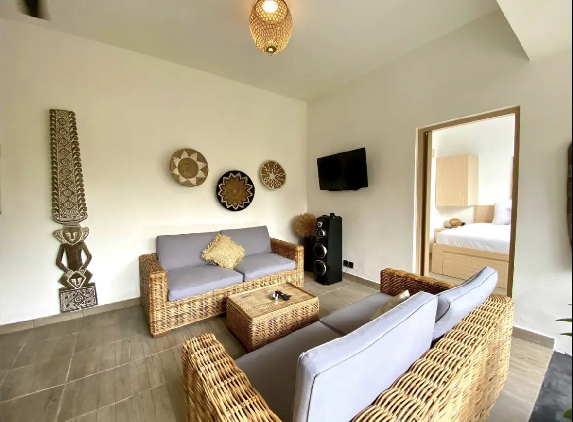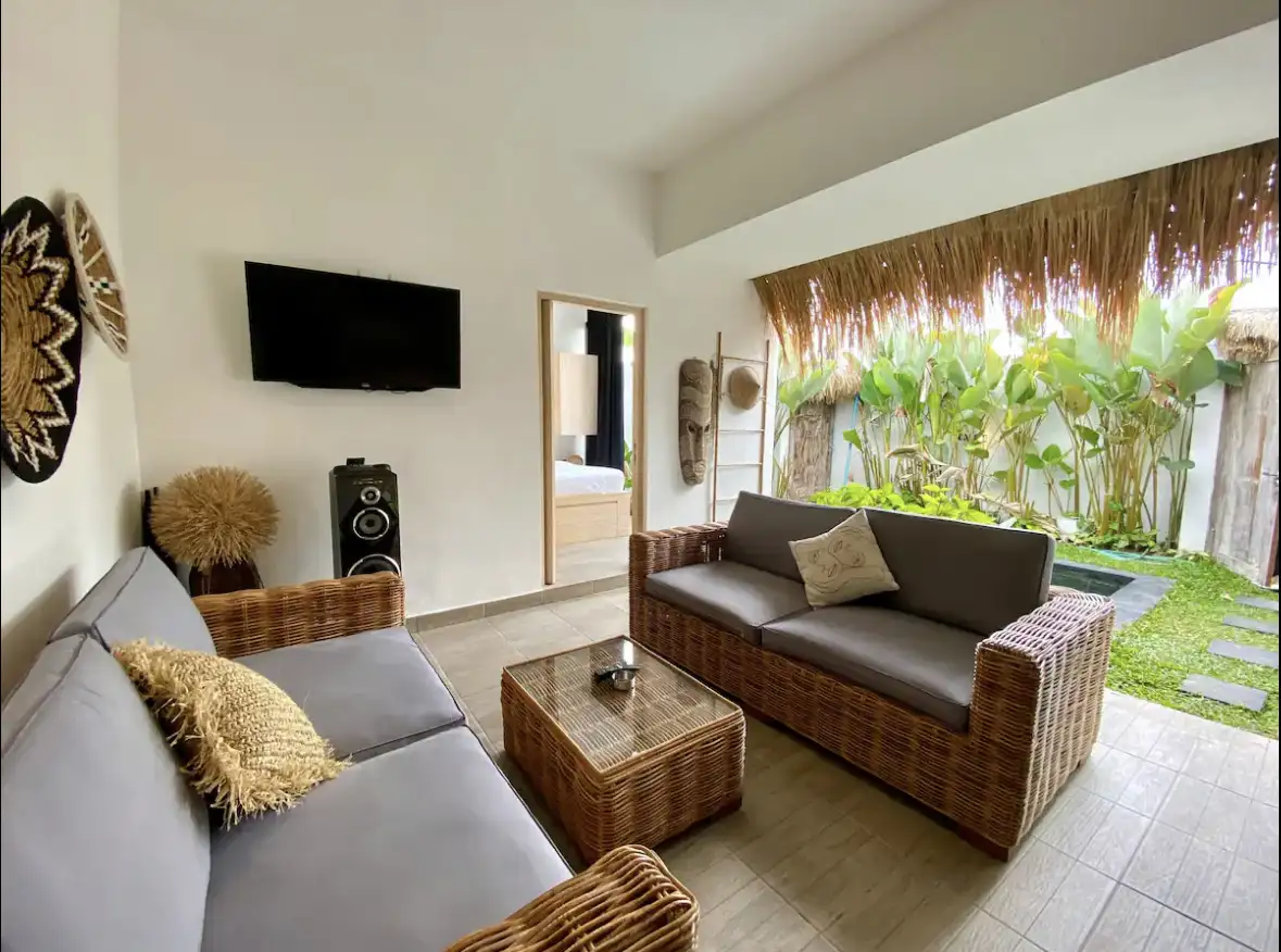 Welcome to the private hideaway in the vibrant Berawa area, just 10 minutes from the beach and surrounded by Bali’s trendiest cafes, restaurants, and boutiques. This fully furnished 2-bedroom villa combines comfort and style with a natural tropical touch. The open-plan living and dining area flows seamlessly into the garden and pool, offering a refreshing indoor-outdoor feel. With rattan furniture, handcrafted wall décor, and large sliding glass doors, the villa embraces a warm, inviting atmosphere while maximizing natural light and airflow.