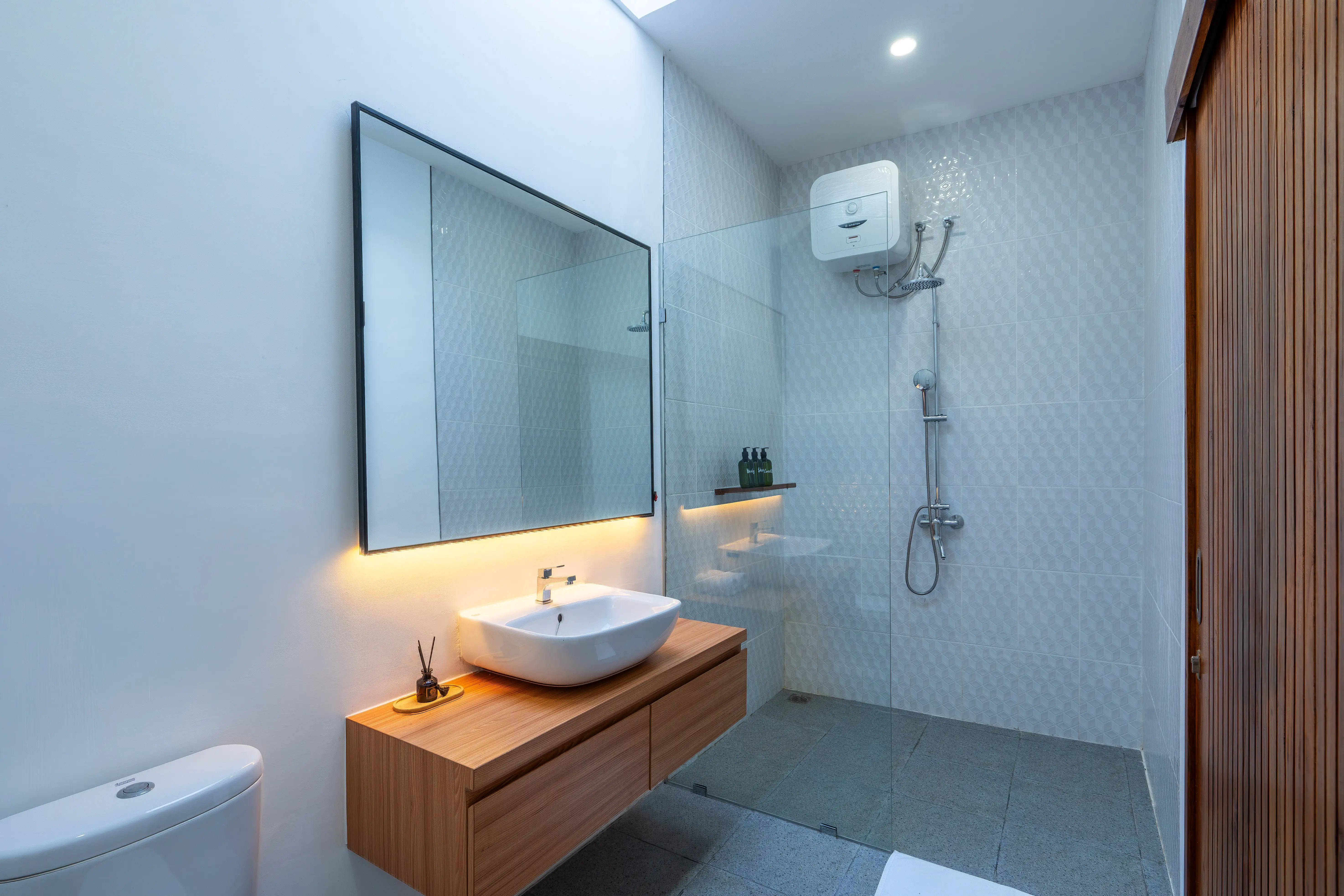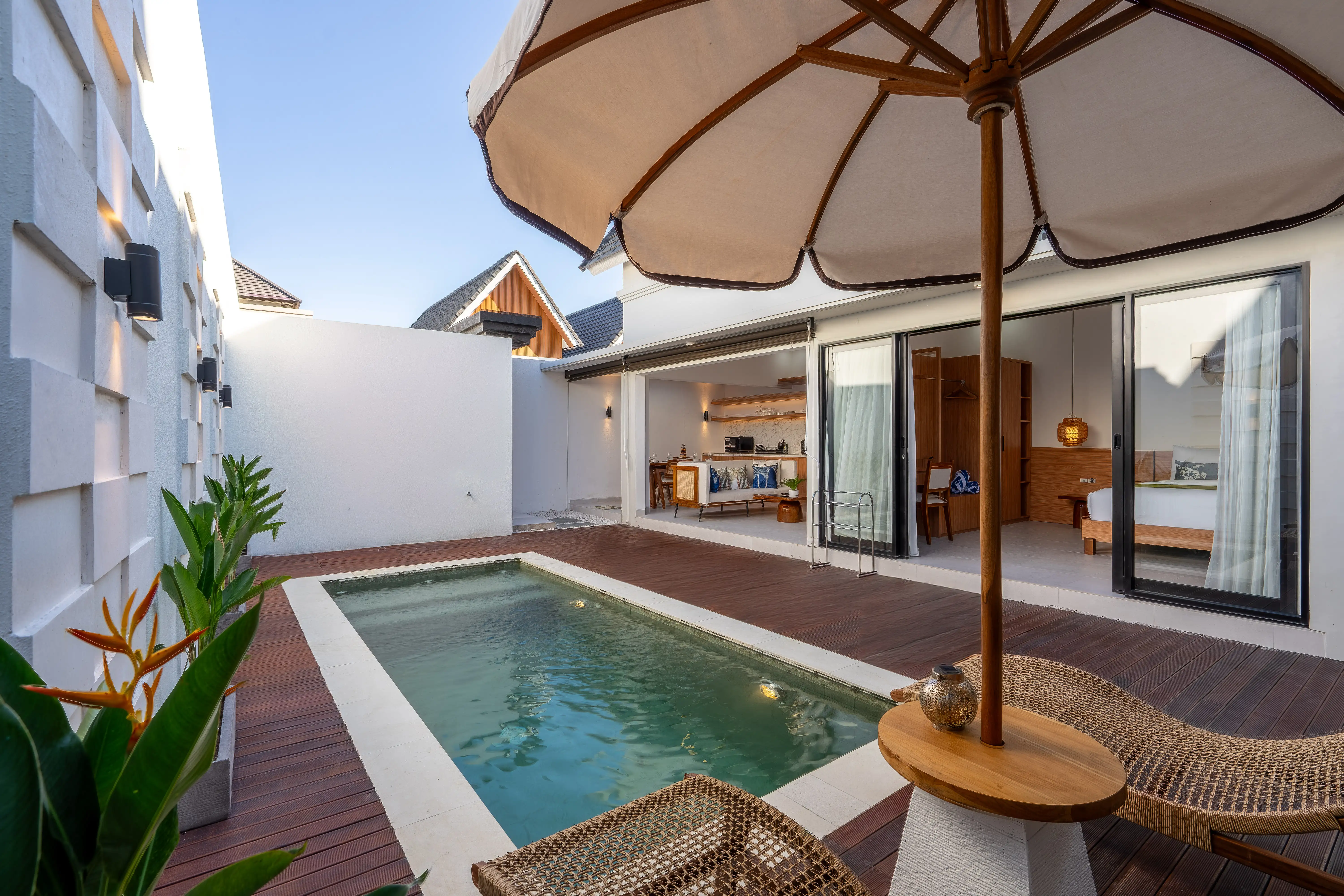 The villa features an open yet well-balanced design with a seamless indoor-outdoor flow. The living area connects directly to the private pool and wooden deck, creating a bright and inviting atmosphere. The space is furnished with a cozy sofa, and tv, while the adjoining modern kitchen and dining area are equipped with high-quality appliances, a full set of utensils, and a wooden dining table perfect for shared meals or casual gatherings. Every detail, from the marble backsplash to the ambient lighting, reflects a refined and warm aesthetic.