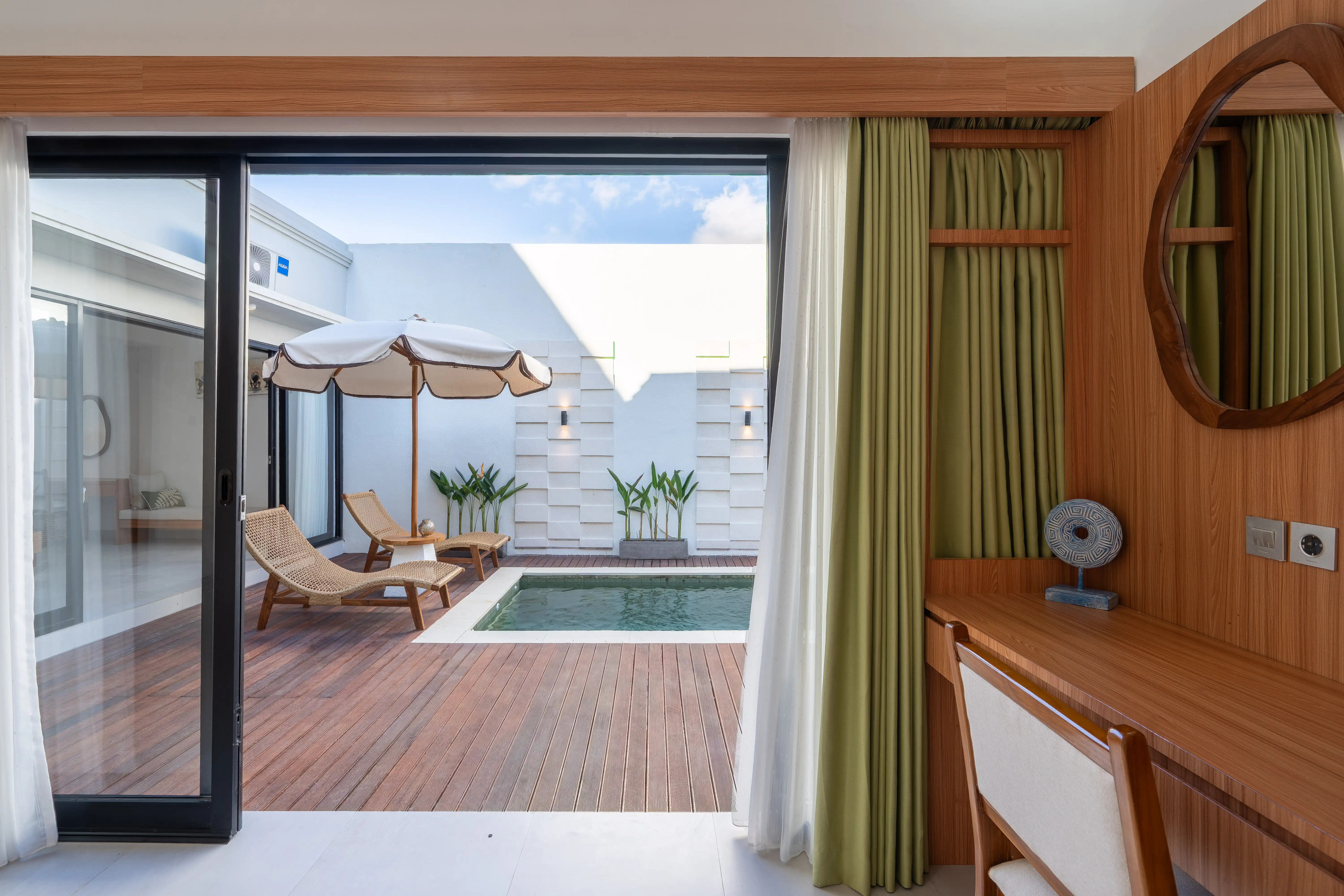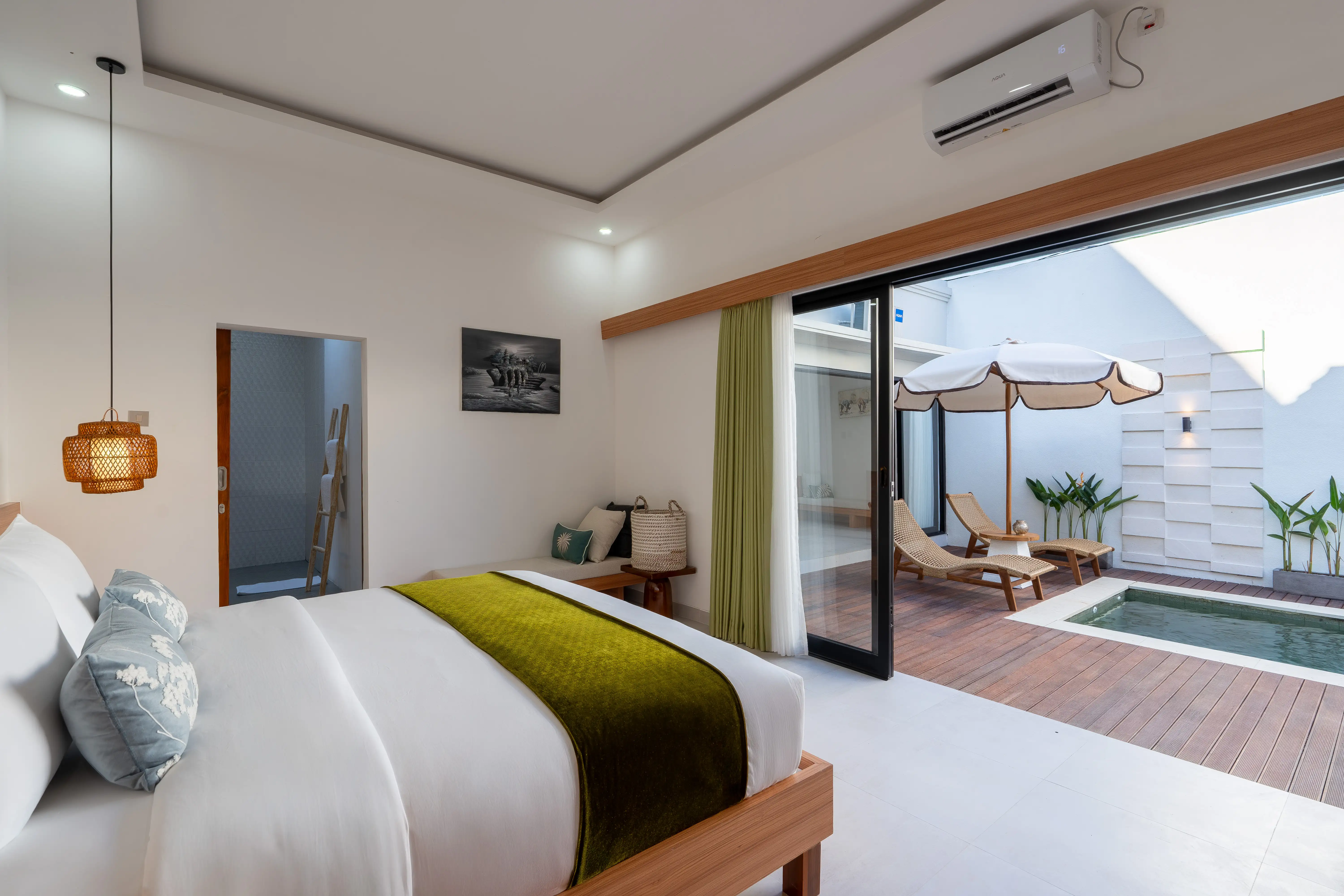 Both bedrooms are designed for comfort and privacy, each featuring ensuite bathrooms and direct pool access. The layout ensures a tranquil environment for rest or remote work. Outside, the private pool area provides a relaxing space for leisure and enjoyment. This villa presents a rare opportunity for a yearly rental in Seminyak, combining modern convenience, Balinese charm, and an unbeatable location—just a few minutes’ drive from Double Six and Legian Beach.