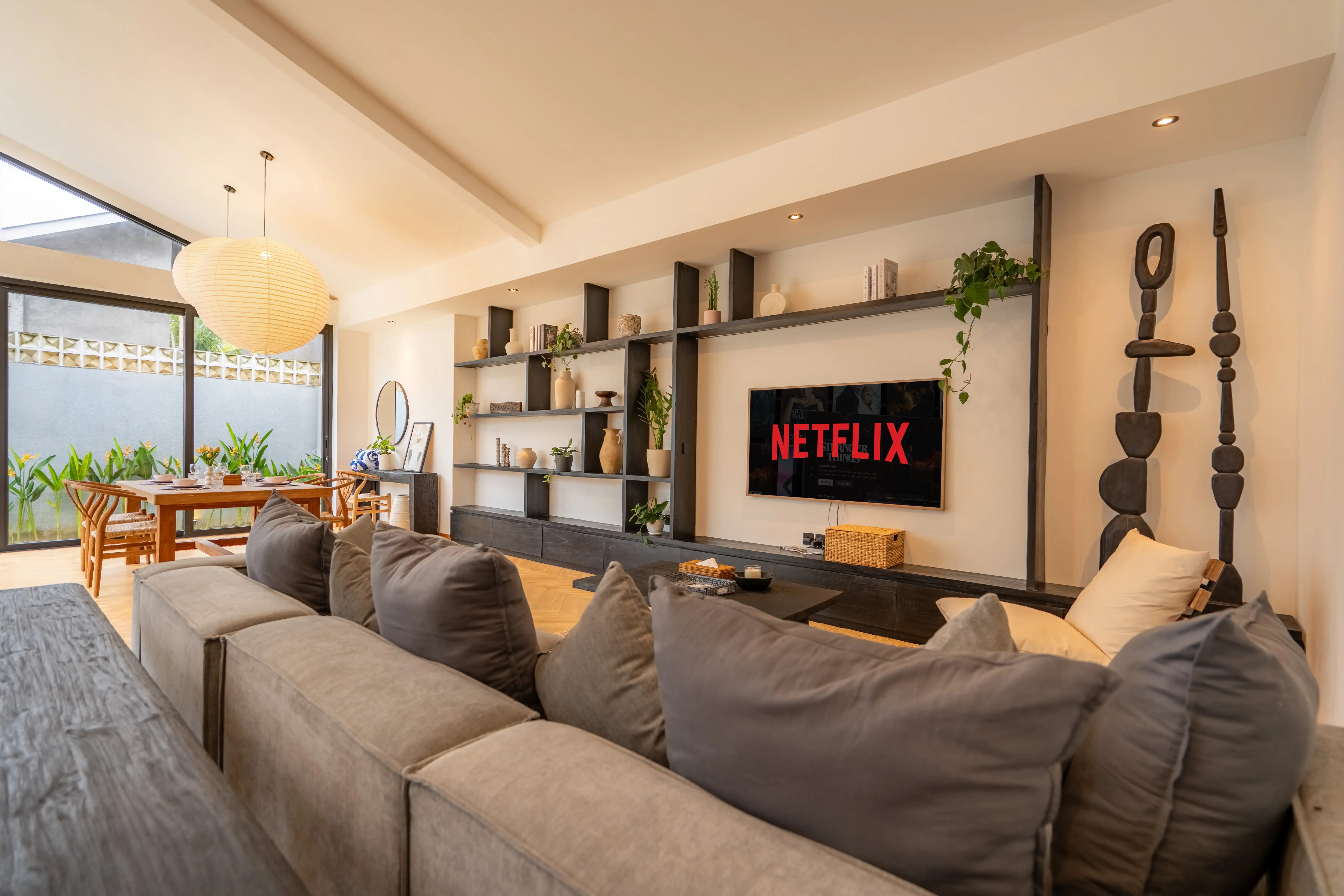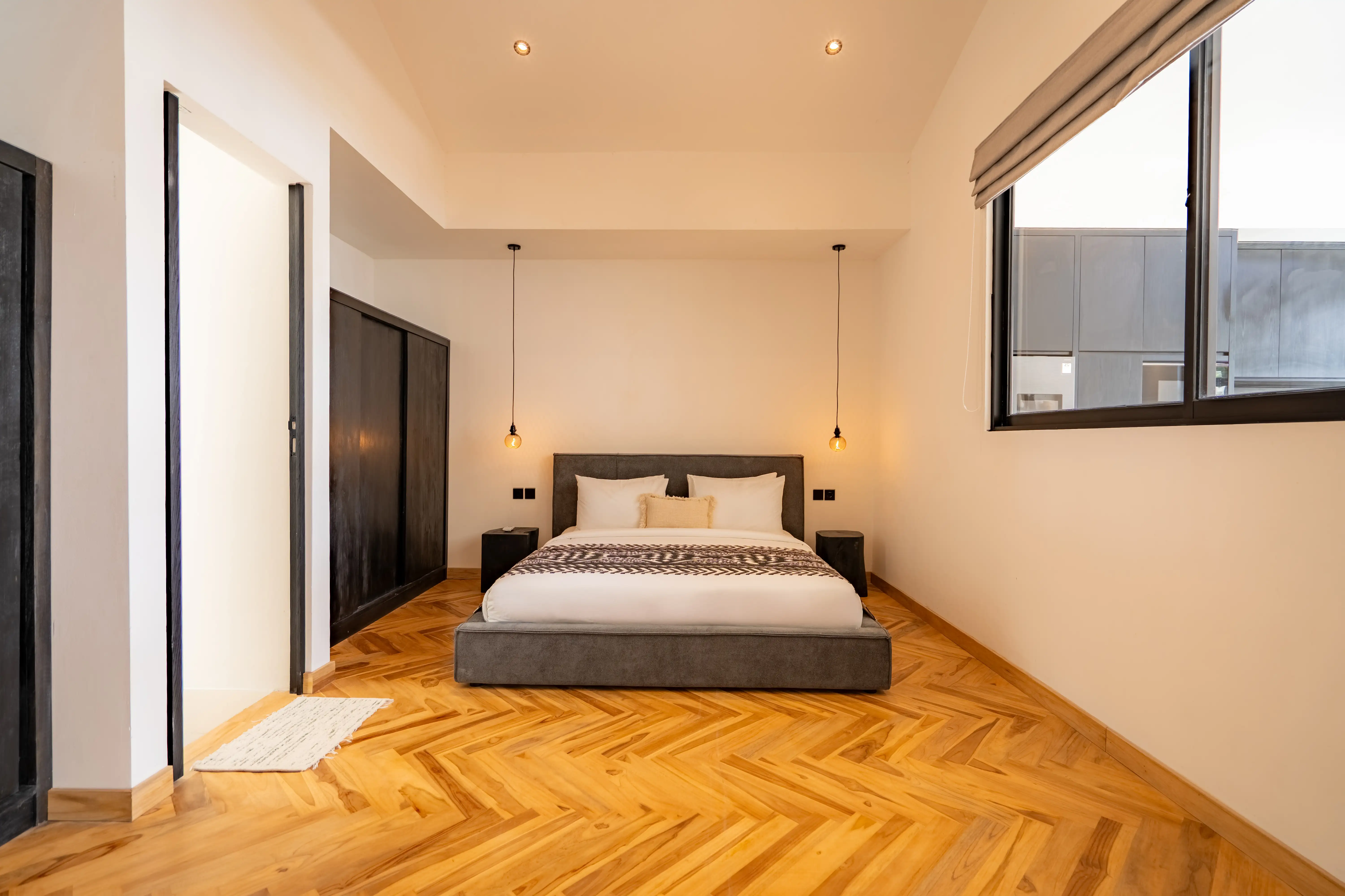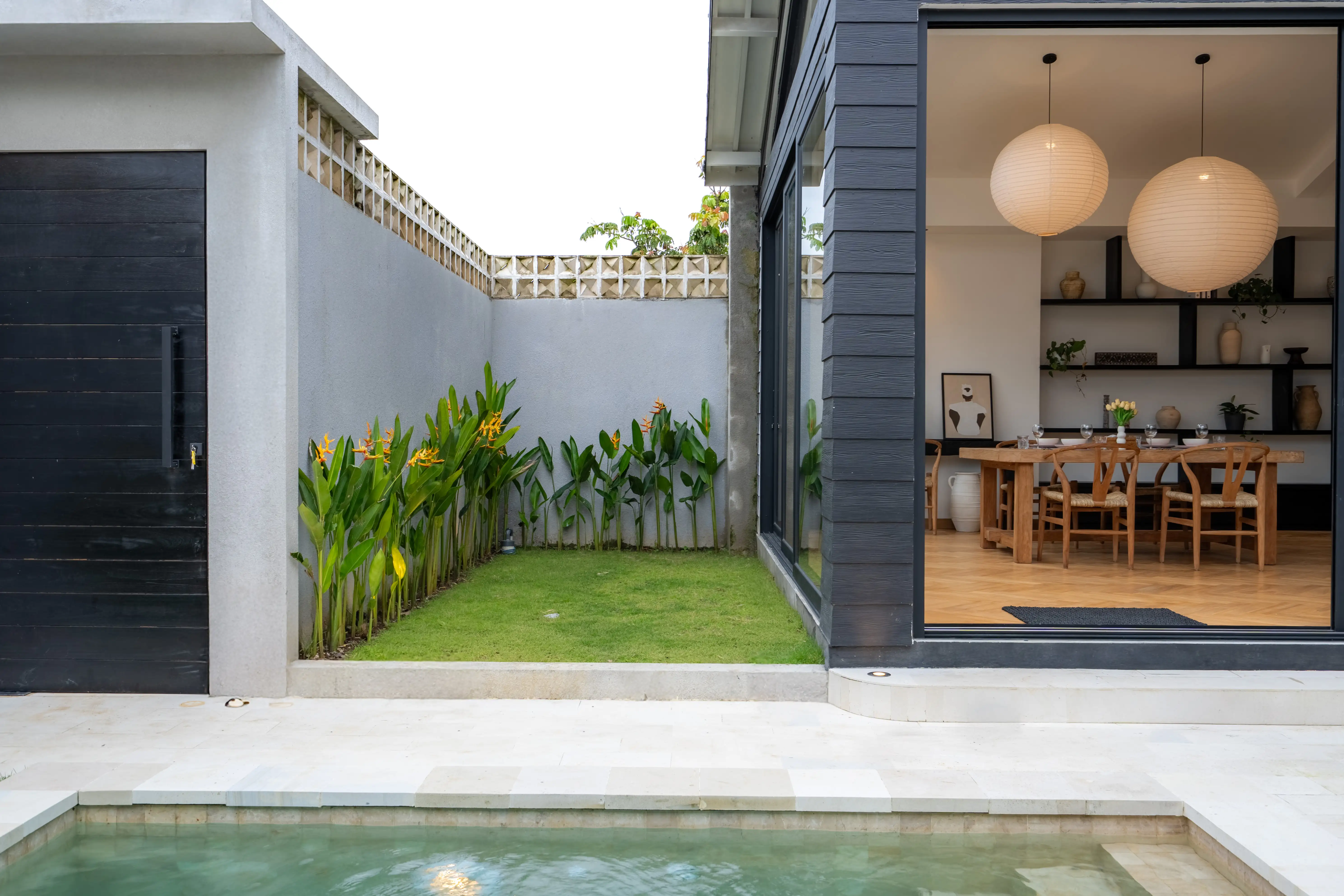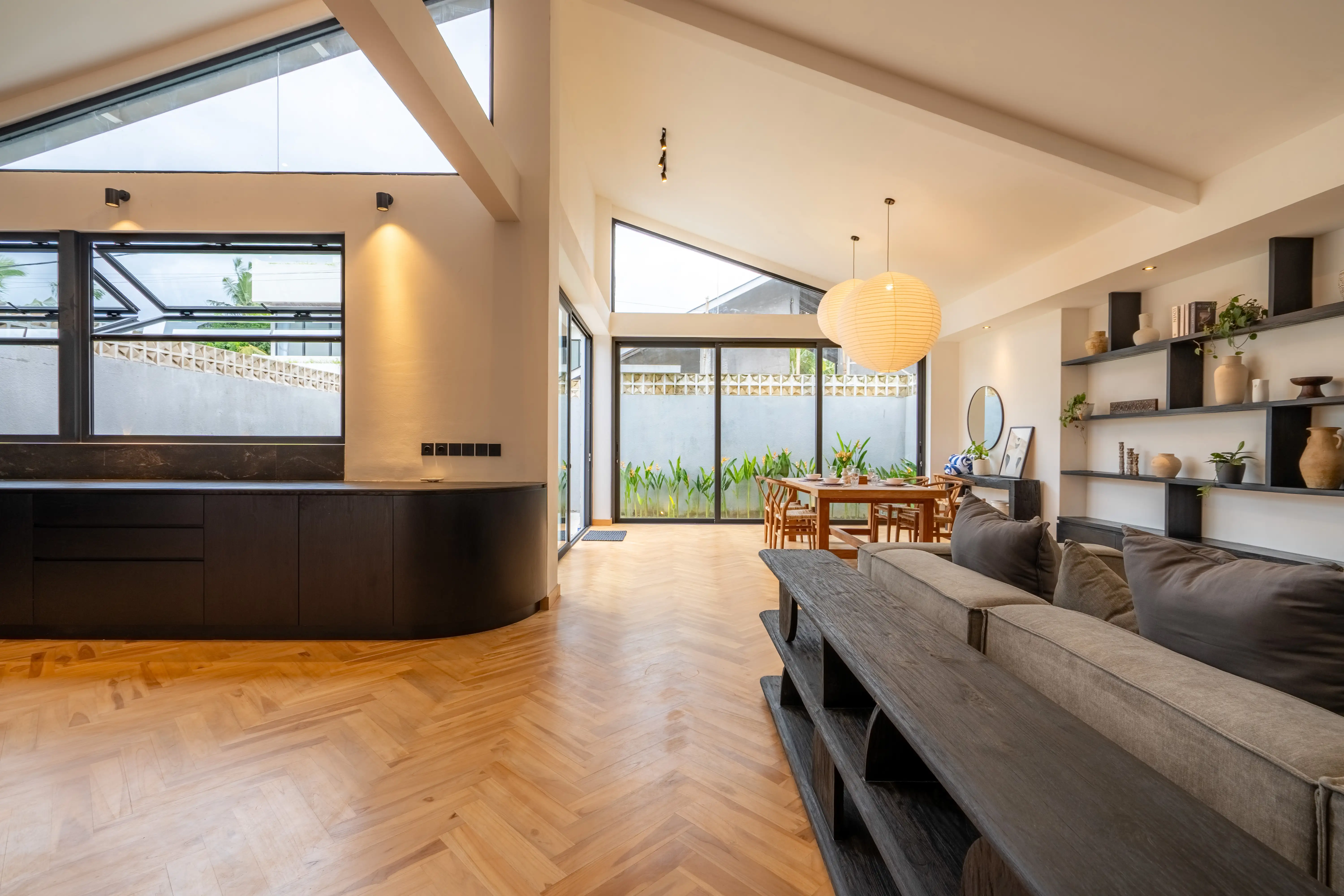 The villa features two well-sized bedrooms, a bright living space, and a warm, welcoming dining area with large glass doors that open directly toward the pool. The interior design focuses on simplicity and functionality, with natural wood finishes, soft lighting, and modern décor that gives the home a relaxed tropical feel. The enclosed living concept makes it comfortable year-round, especially during the warmer months, while still giving you that indoor-outdoor Bali atmosphere through wide sliding doors and garden views. The dining area is spacious and practical—perfect for daily meals, working from home, or hosting friends. Large windows bring in strong natural light, making the home feel airy from morning until late afternoon.