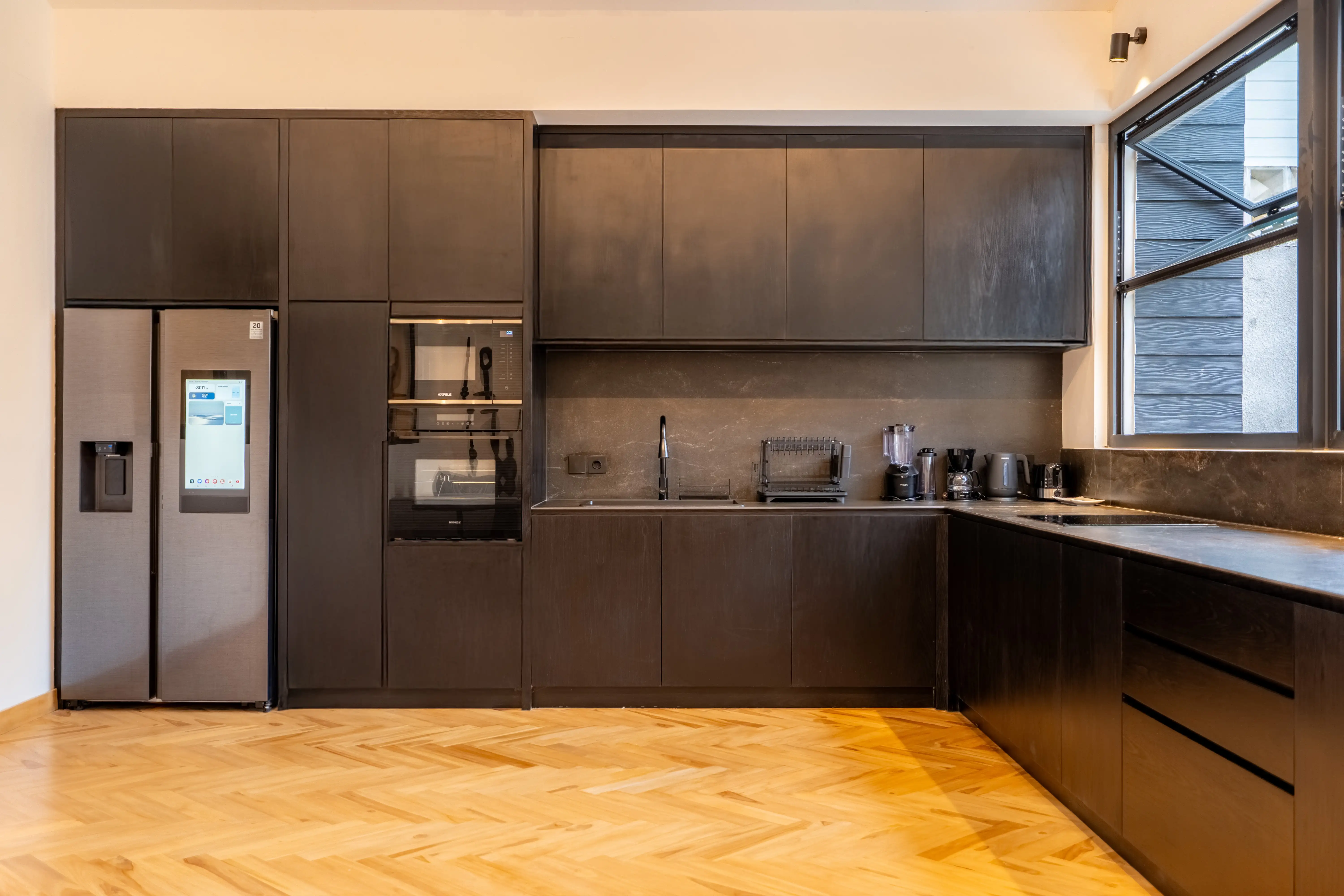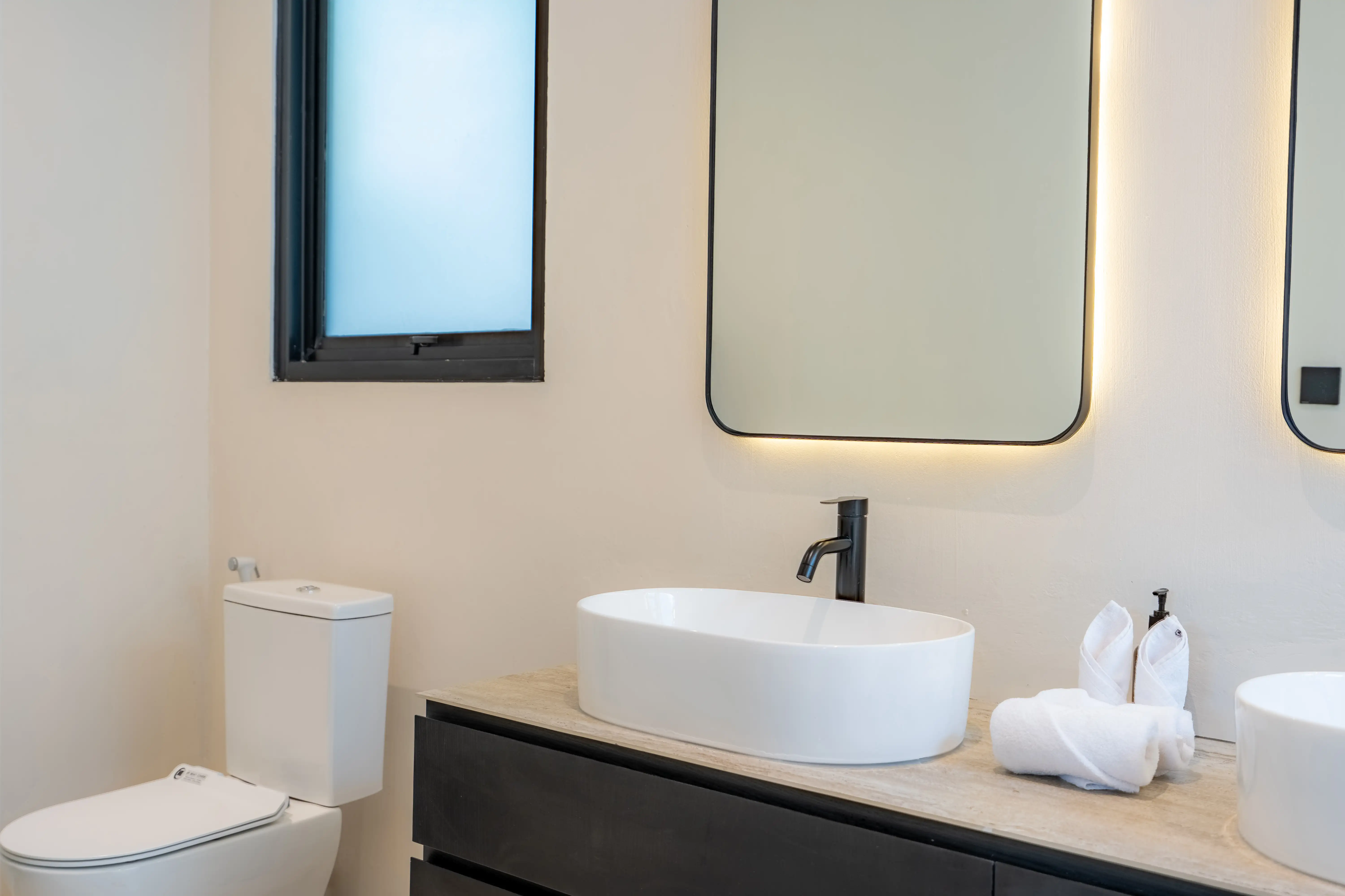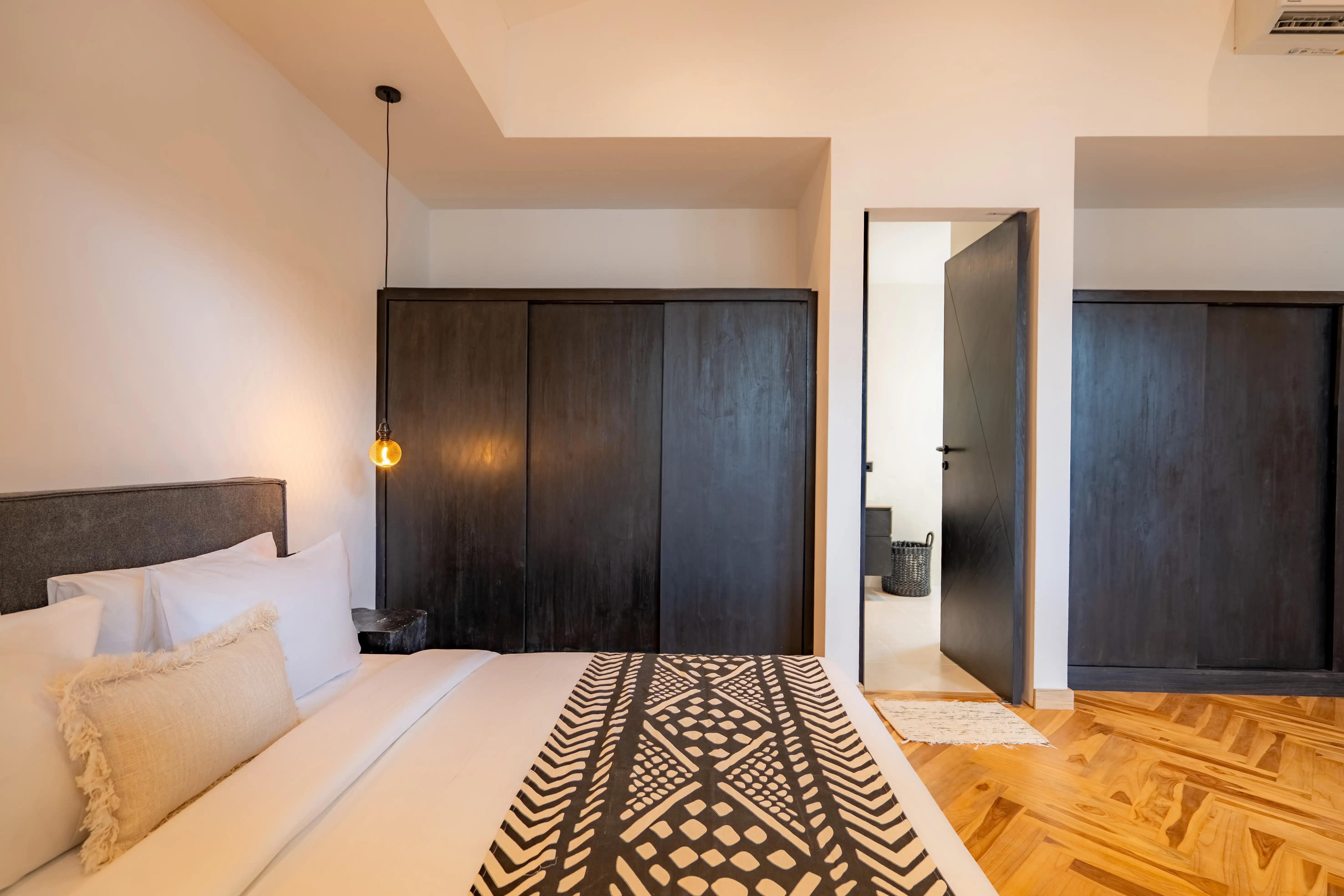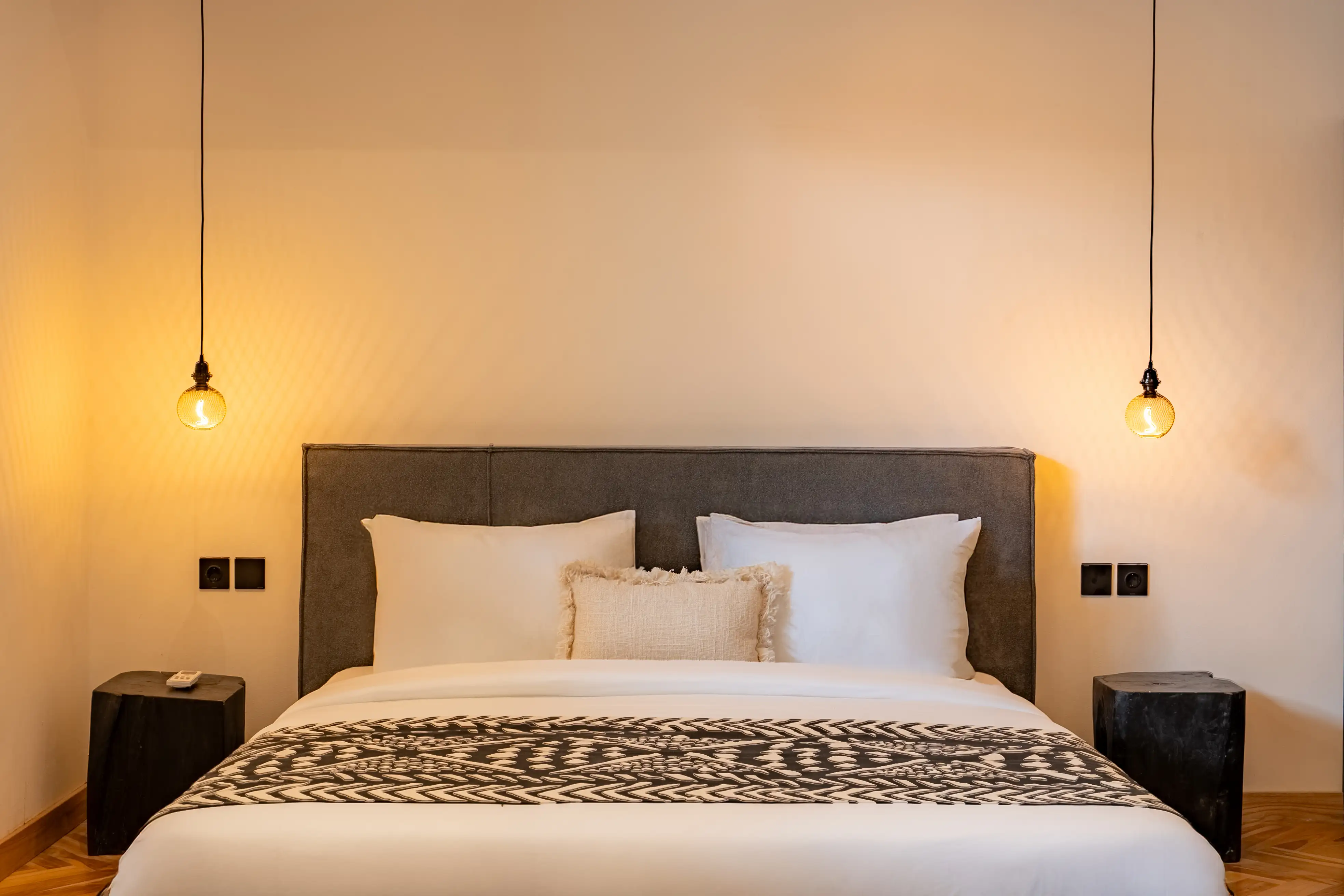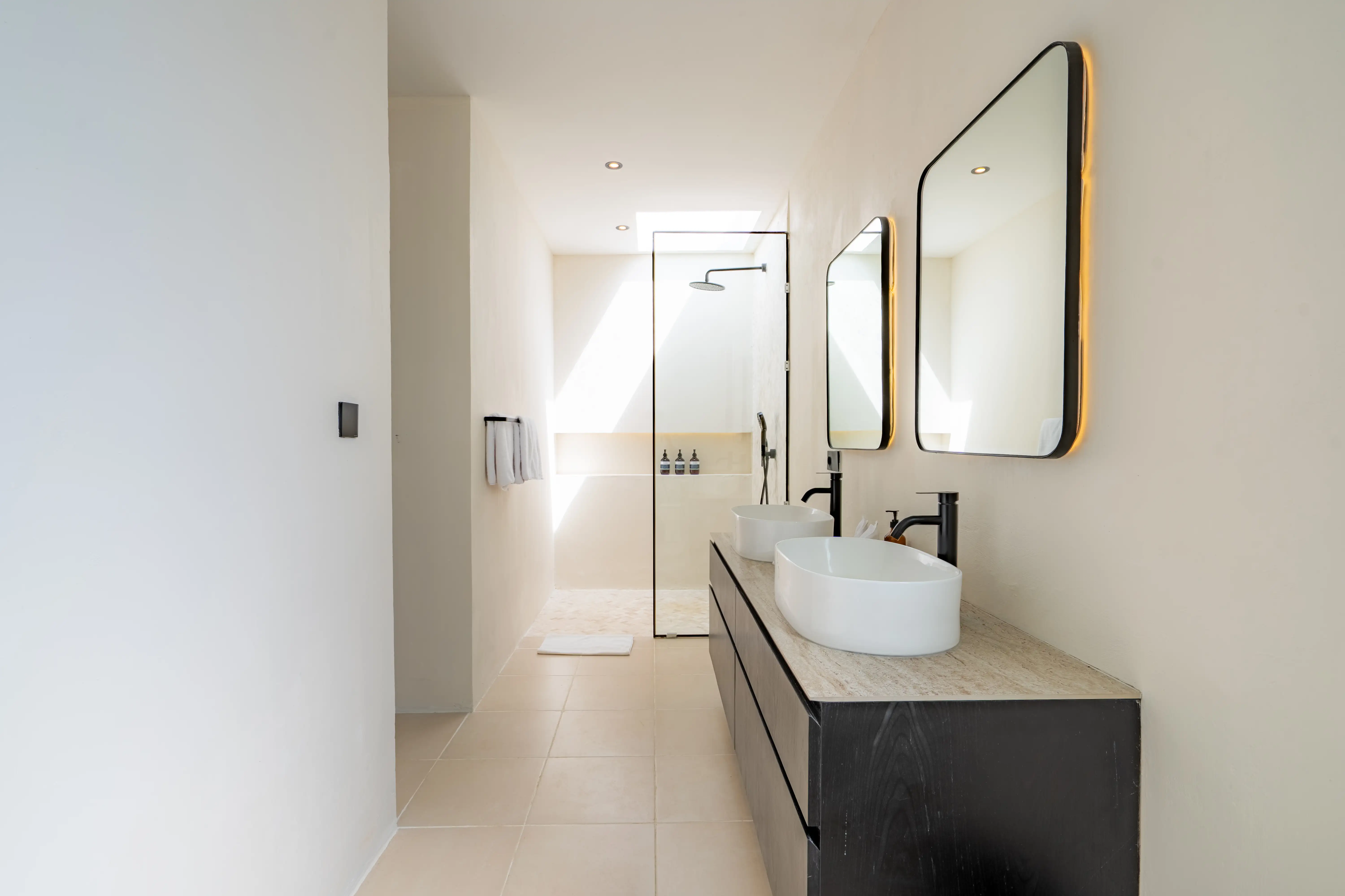 The villa features two well-sized bedrooms, a bright living space, and a warm, welcoming dining area with large glass doors that open directly toward the pool. The interior design focuses on simplicity and functionality, with natural wood finishes, soft lighting, and modern décor that gives the home a relaxed tropical feel. The enclosed living concept makes it comfortable year-round, especially during the warmer months, while still giving you that indoor-outdoor Bali atmosphere through wide sliding doors and garden views. The dining area is spacious and practical—perfect for daily meals, working from home, or hosting friends. Large windows bring in strong natural light, making the home feel airy from morning until late afternoon.