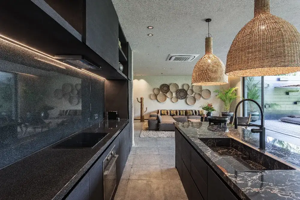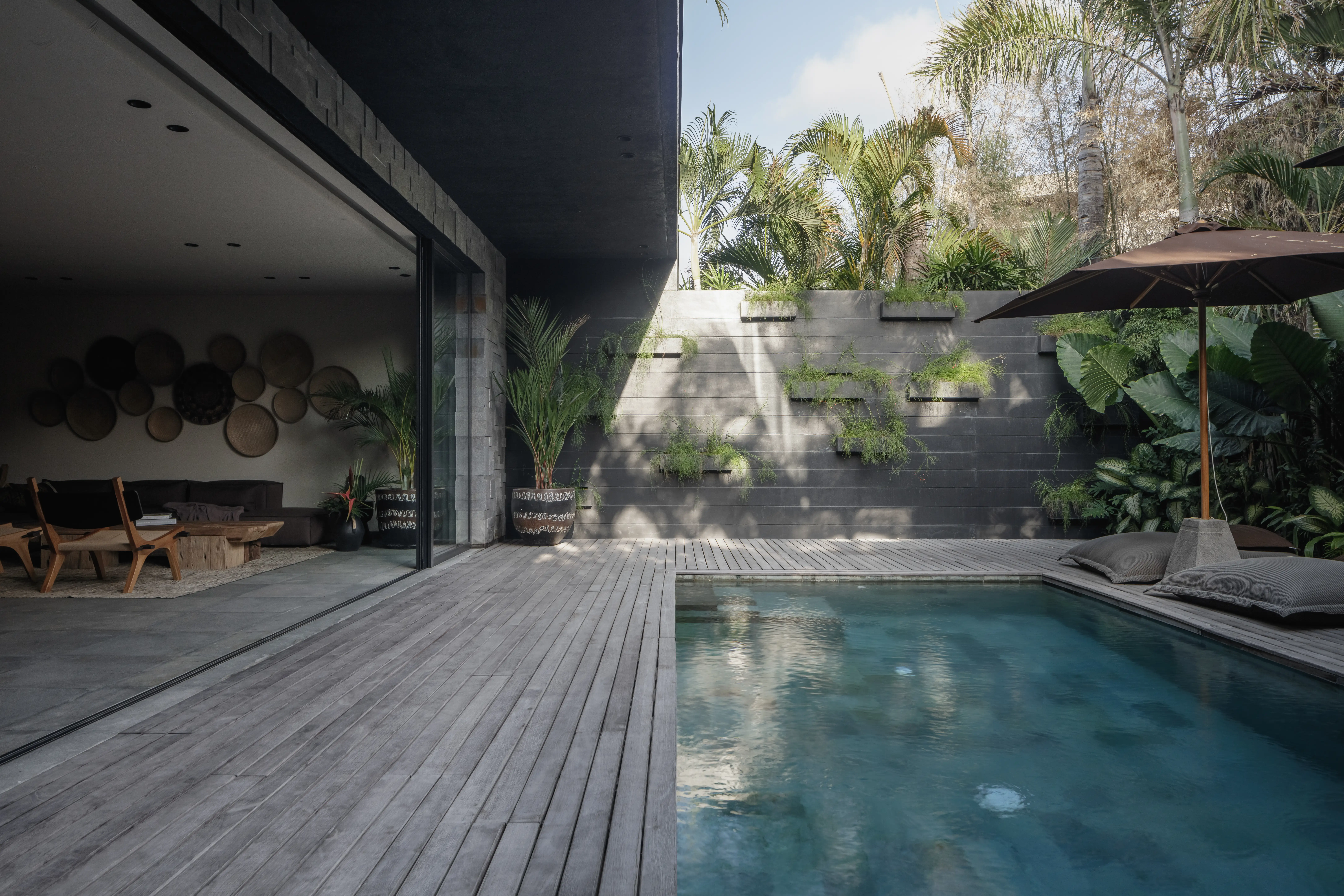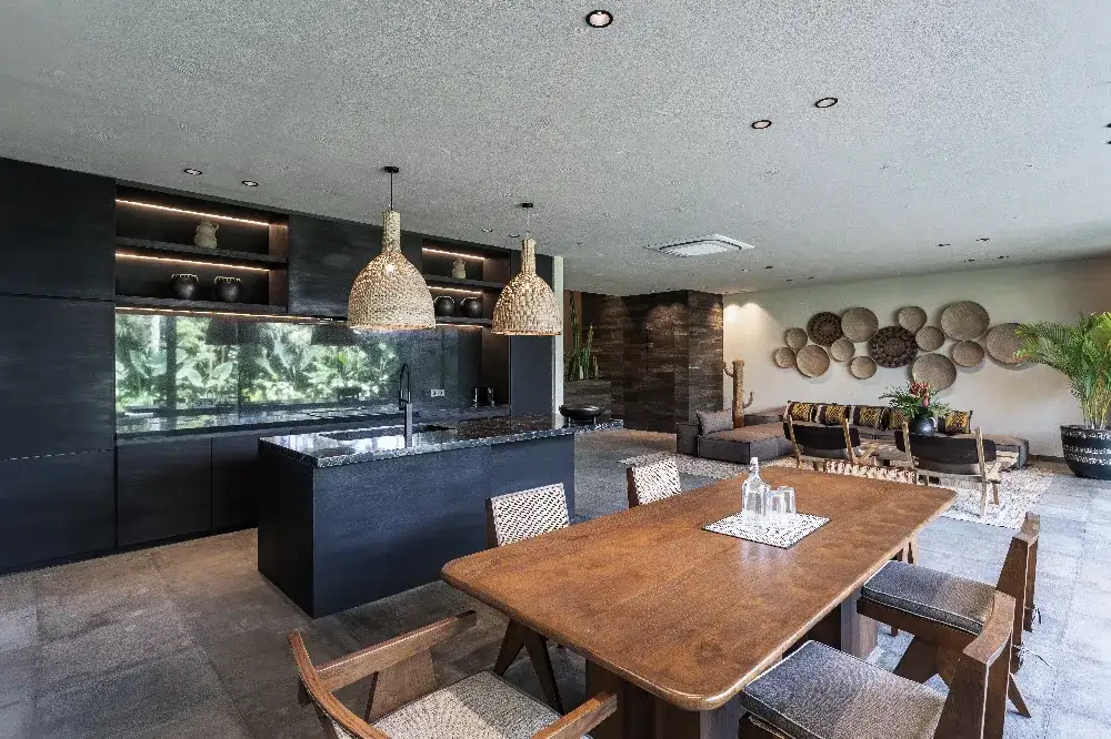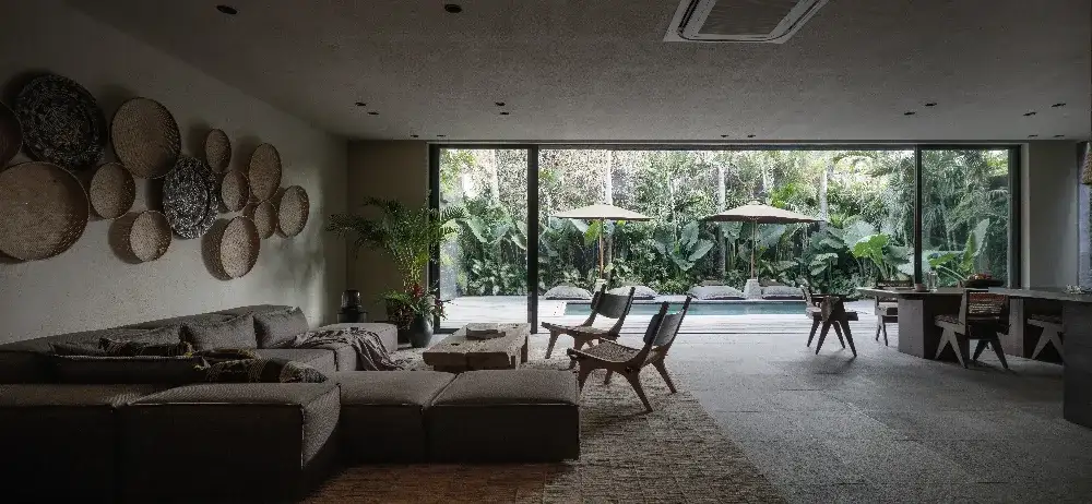 Set within a lush, private tropical setting, this contemporary villa showcases a refined blend of clean architectural lines and natural warmth, creating an atmosphere that feels both sophisticated and effortlessly inviting. The expansive open-plan layout connects directly to the landscaped pool area, allowing soft natural light to flow across the dining and lounge spaces. Large floor-to-ceiling glass panels dissolve the boundary between inside and outside, framing the greenery and giving the entire villa a tranquil resort-style ambience that feels timeless and highly exclusive.