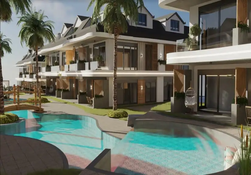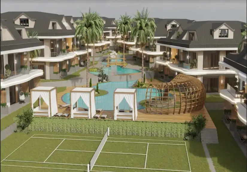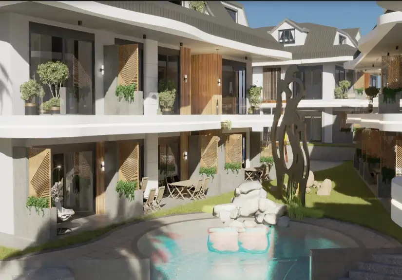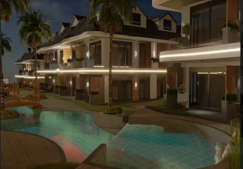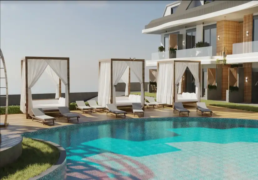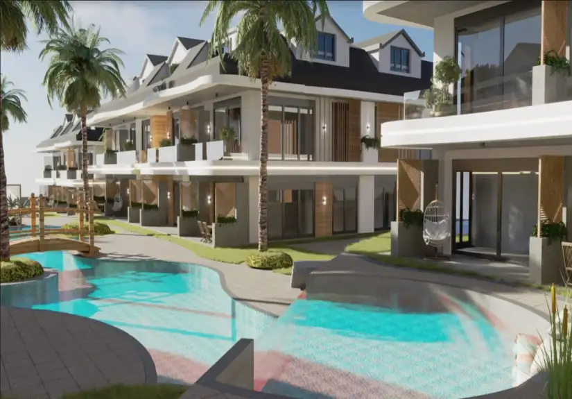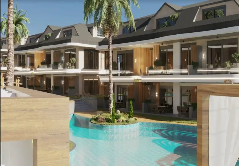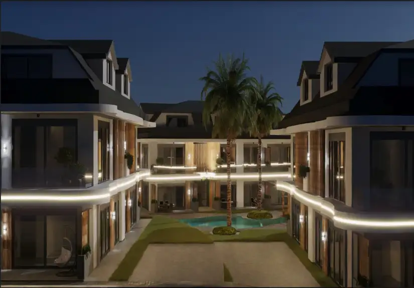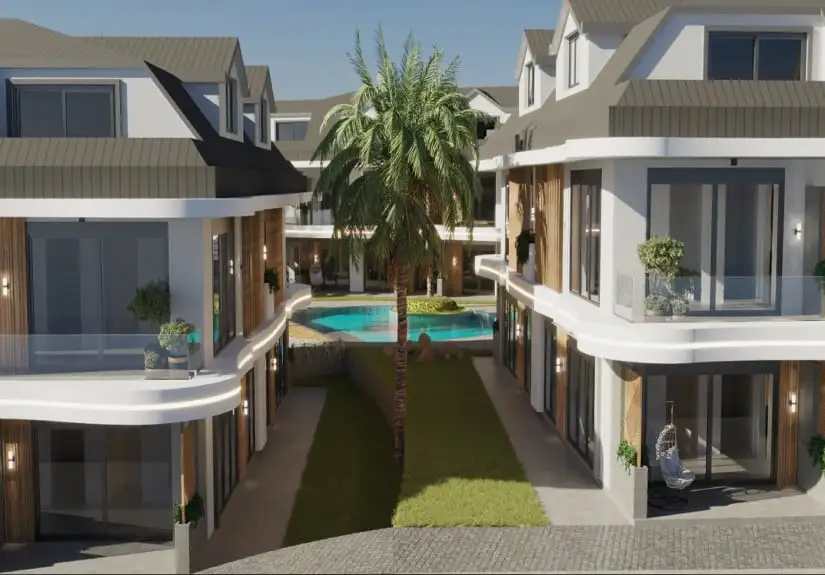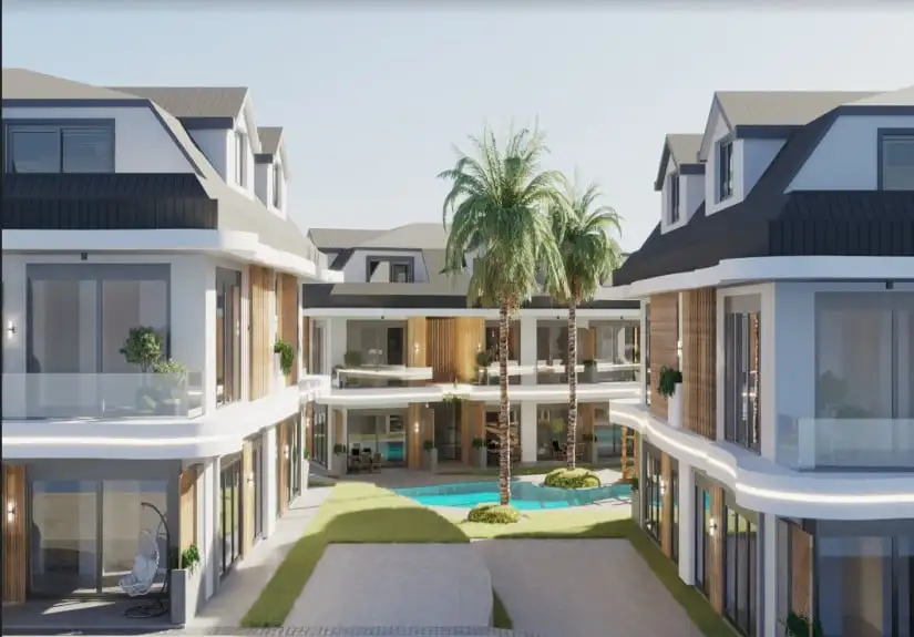 Project was built on an area of 8680 square meters and consisted of eight blocks. Built in a large area, the project offers spacious and modern living spaces to its residents. The project, which has two floors in each block, has the 1-bedroom garden floor, and 2-bedroom duplex apartment options. While a 1-bedroom is 61 square meters, a 2-bedroom is 85 square meters. Furthermore, Project has an amazing landscape area with a unique concept. Palm trees, the pool passing by the garden floor houses, and detailed with the aesthetic meeting of wood and marble arouse admiration.