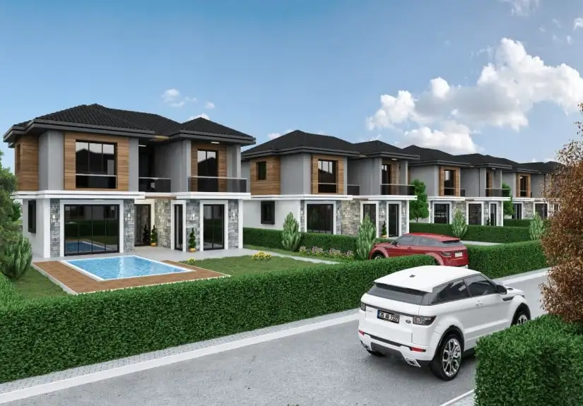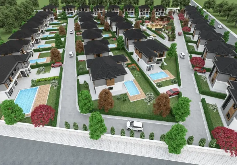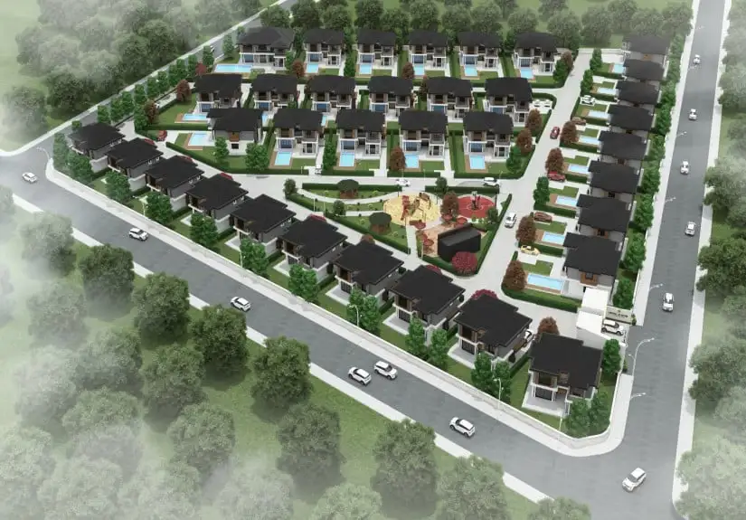 There are a total of 35 villas in the project, including ten 4-bedroom villas, nineteen 4-bedroom villas with pools, five 5-bedroom villas with pools, and one 9-bedroom villa with pools. Each villa has extensive gardens that open to peace and nature. There is also a children's playground in the project, which is a place where your children can run and play safely. There are gazebos in the project where you can have pleasant conversations with your neighbors. It is possible to enjoy a walk in touch with nature and a nice basketball tournament here.