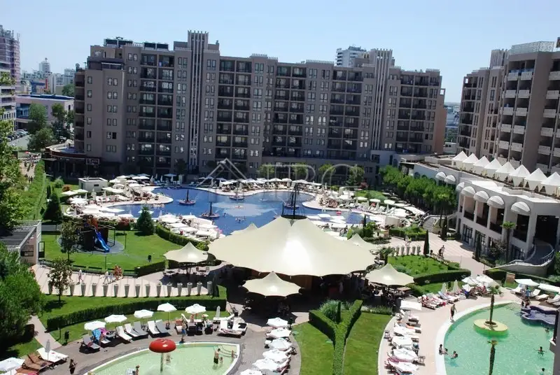 IBG Real Estates presents for sale this elegant 1-bedroom apartment with a big terrace and pool view, located in the prestigious Royal Beach Barceló complex, just steps away from the beach and the central promenade of Sunny Beach. The location is excellent – surrounded by shops, restaurants, beach bars, and summer attractions, all within walking distance.