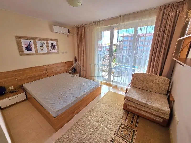 The total size of the apartment is 75 sq.m. and it consists of a living room with kitchen and dining area, a balcony overlooking the swiming pool, a bedroom and a bathroom with shower cabin, toilet and sink. The apartment is for sale furnished and equipped as shown on the pictures.