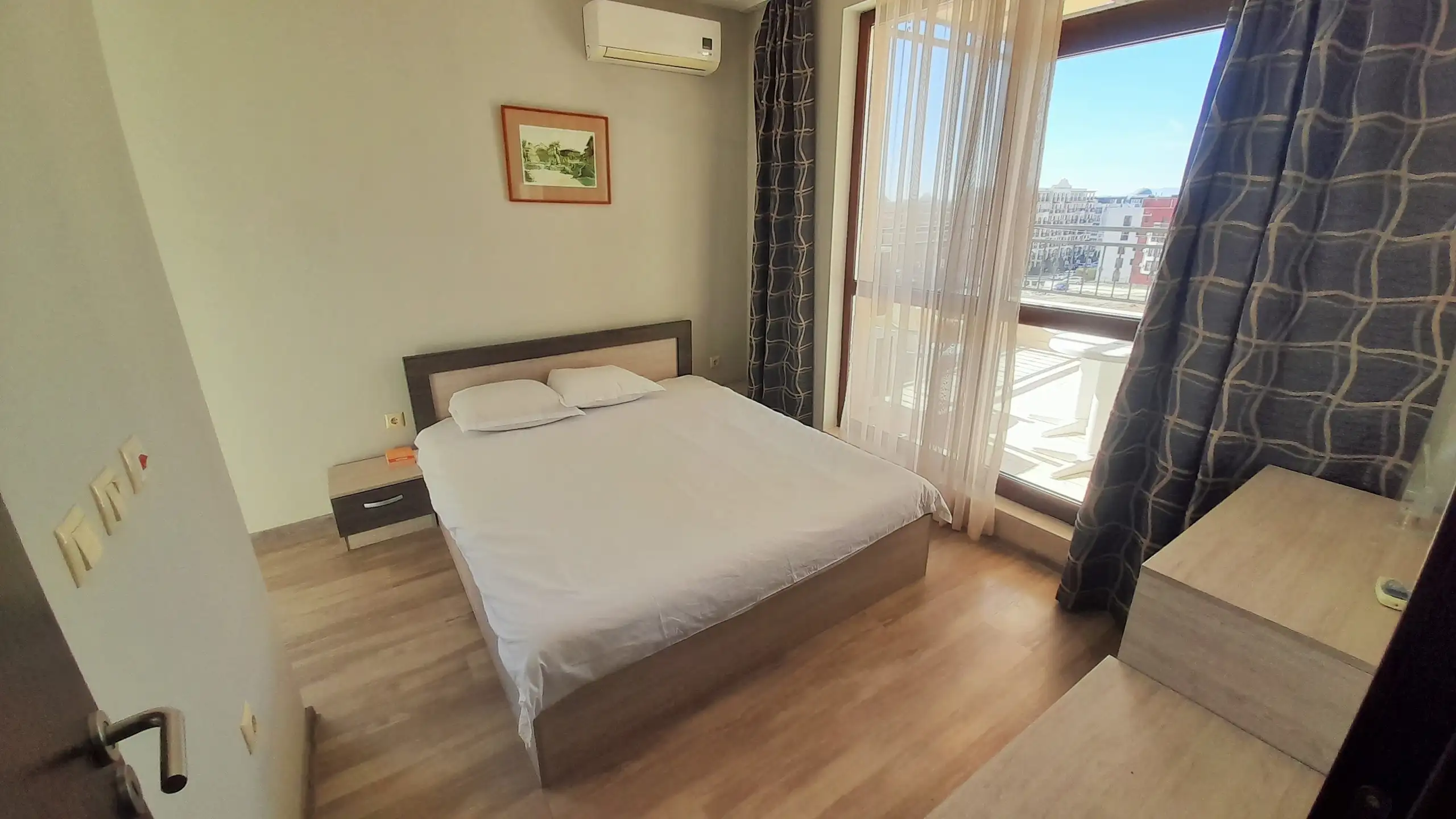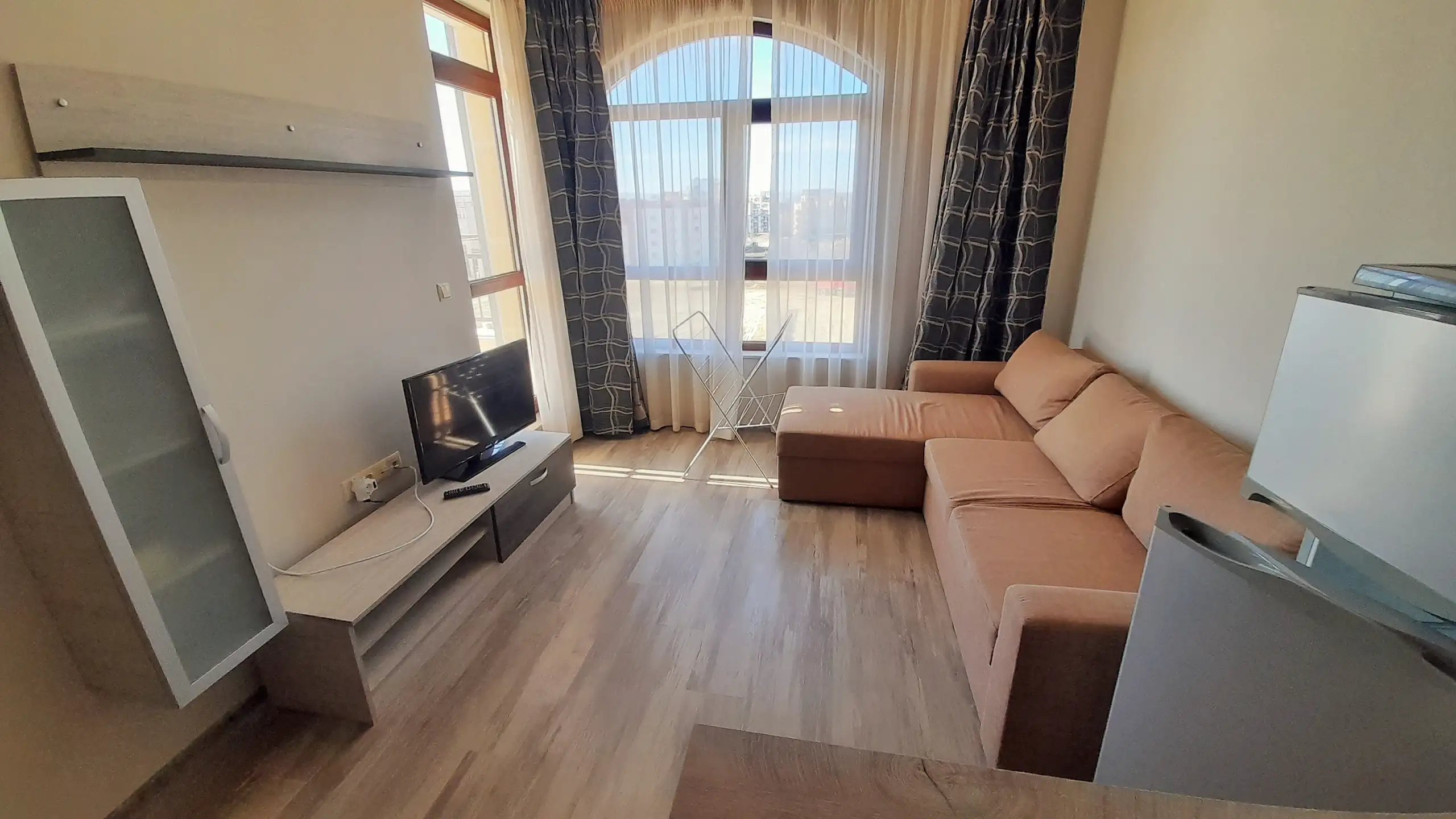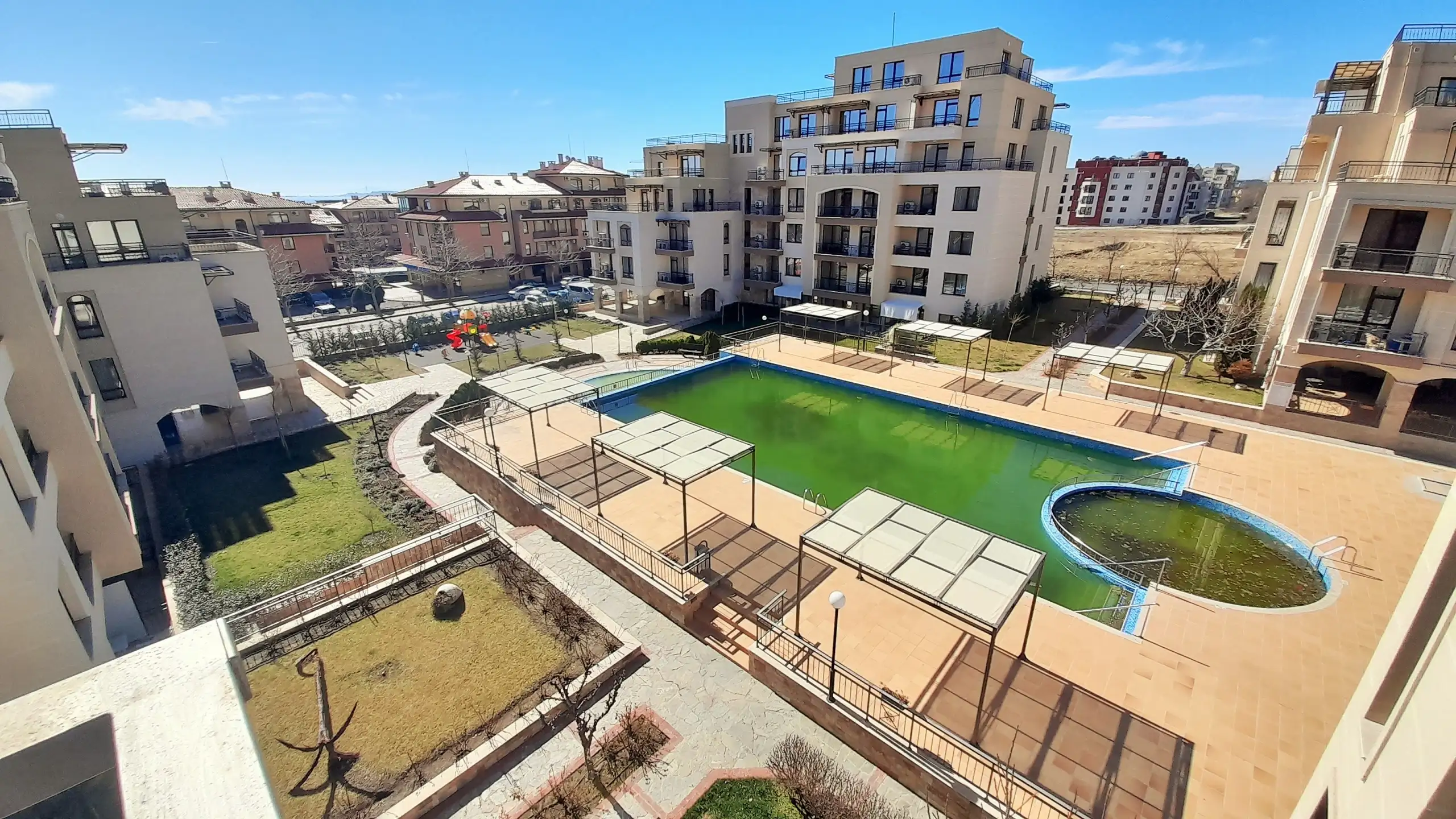 One Bedroom apartment located on the 4th floor in complex Sorento Sole Mare. The complex is located in a quiet area between the resorts of Sunny Beach and St. Vlas at 300 meters from the sea and the beautiful sandy beach. Sorento Sole Mare is a new built gated complex with big swimming pool with children’s section, located among green areas, reception, spacious lobby, playground and parking.