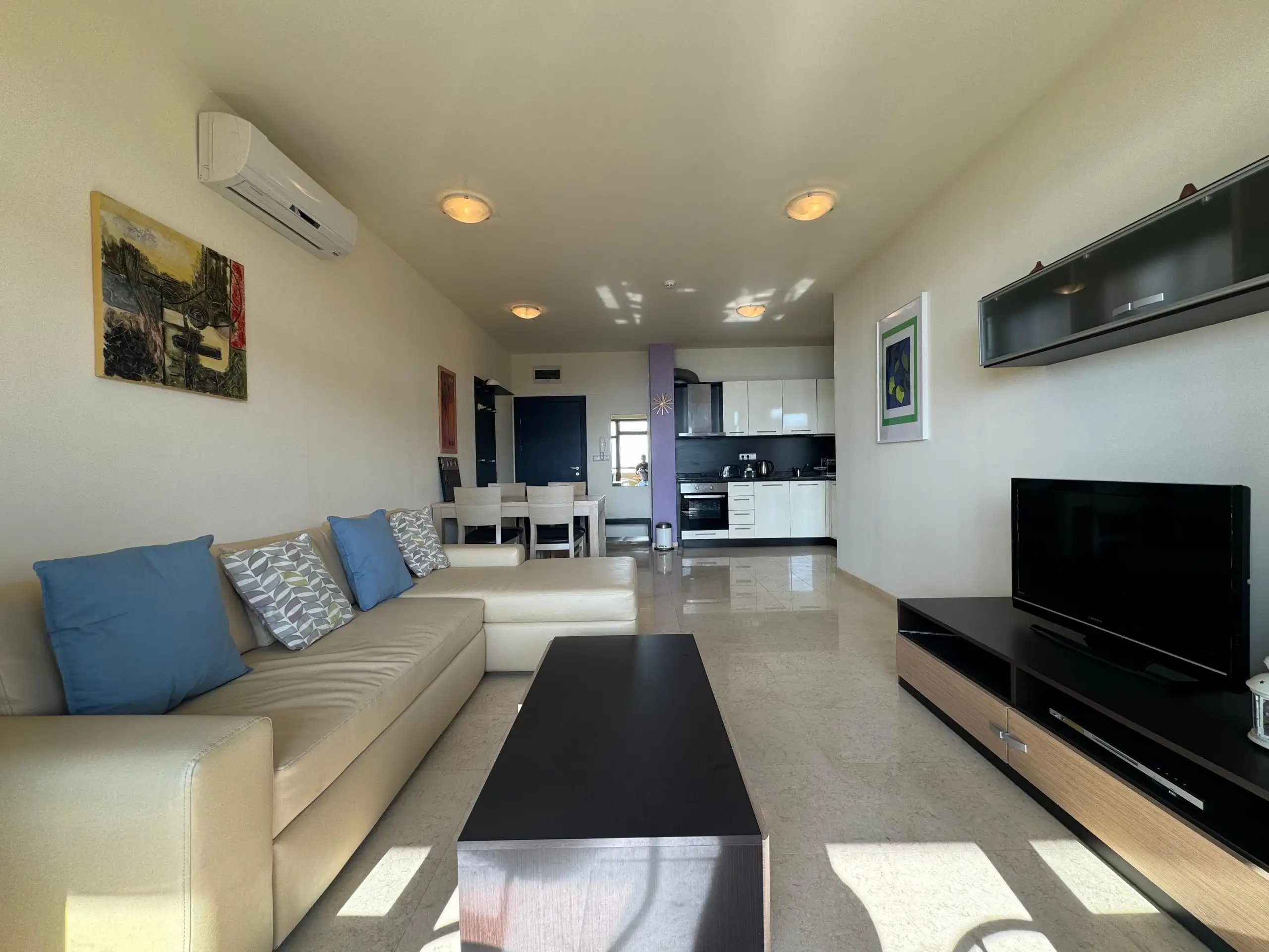 Spacious living room with kitchenette and dining area