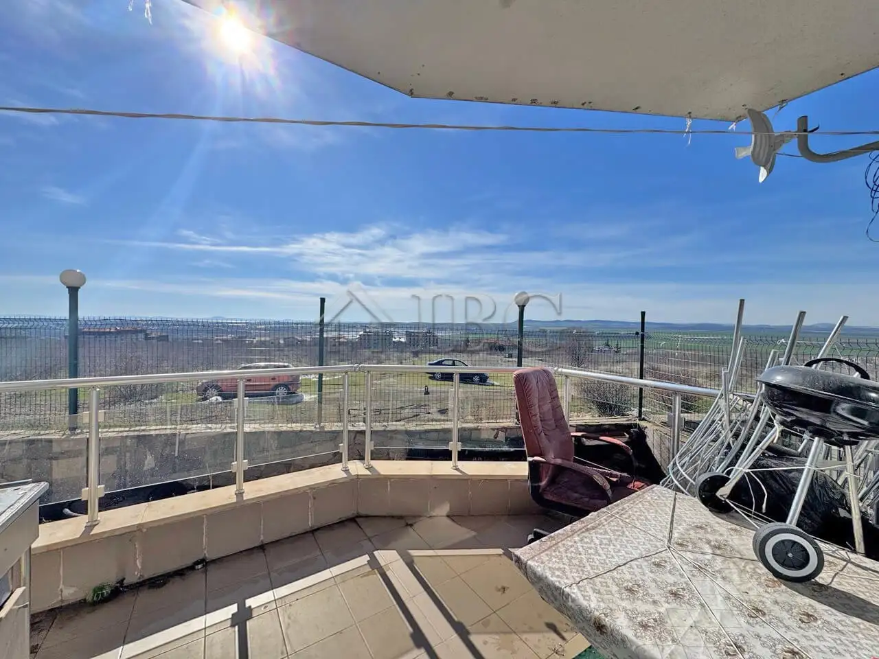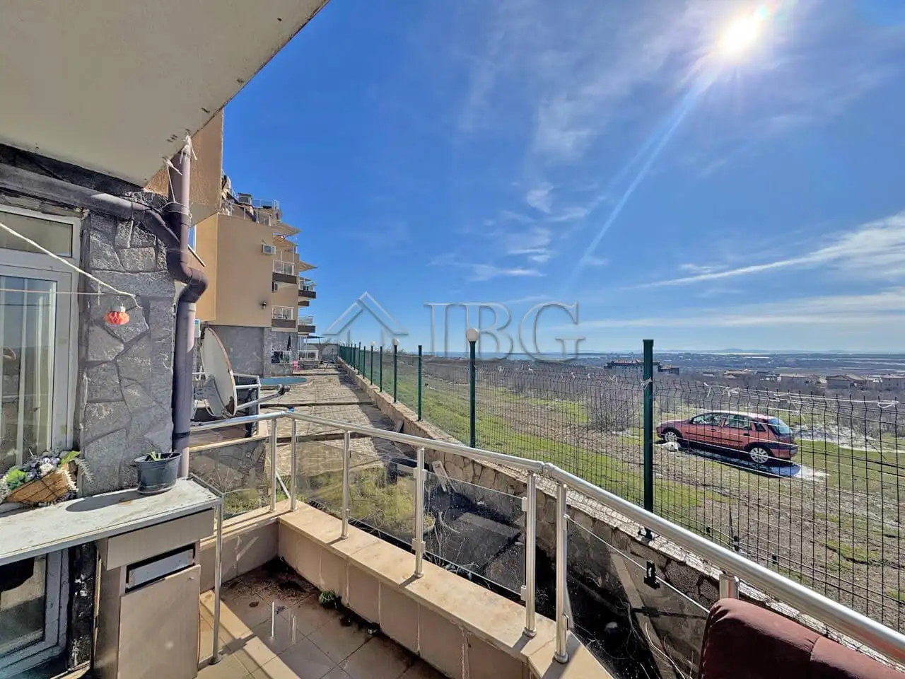 The apartment consists of a large living room with kitchenette, a bright separate bedroom, a bathroom, and a spacious terrace with panoramic views towards the sea, Sunny Beach and Nessebar.