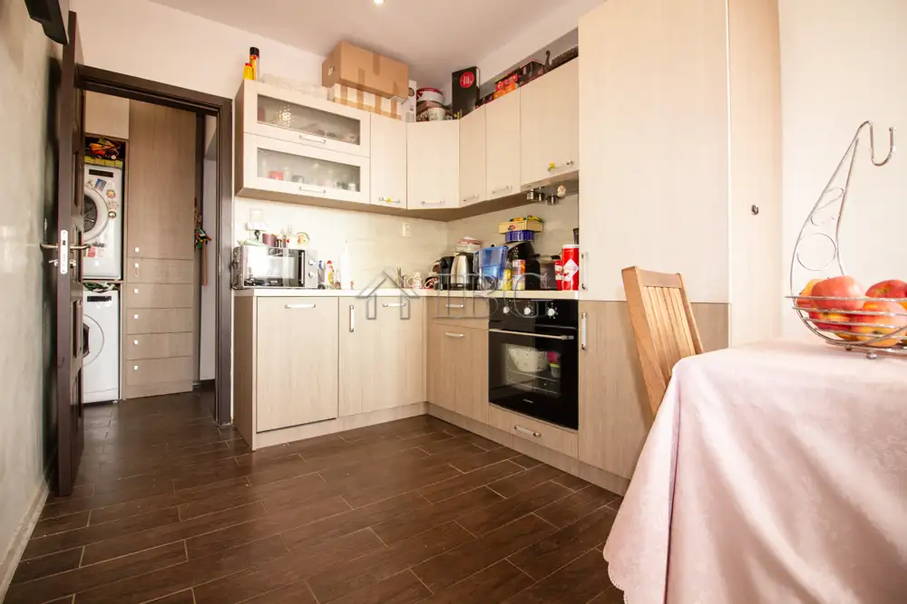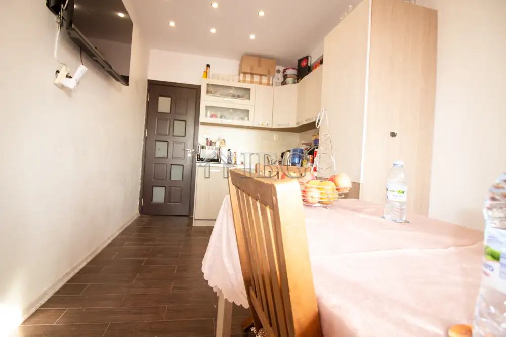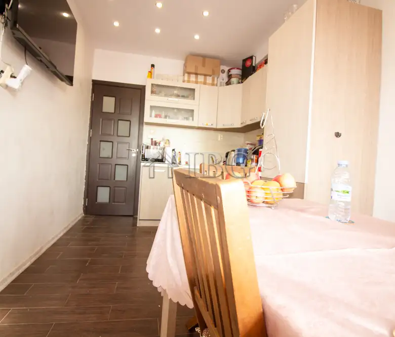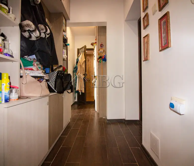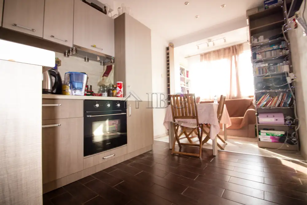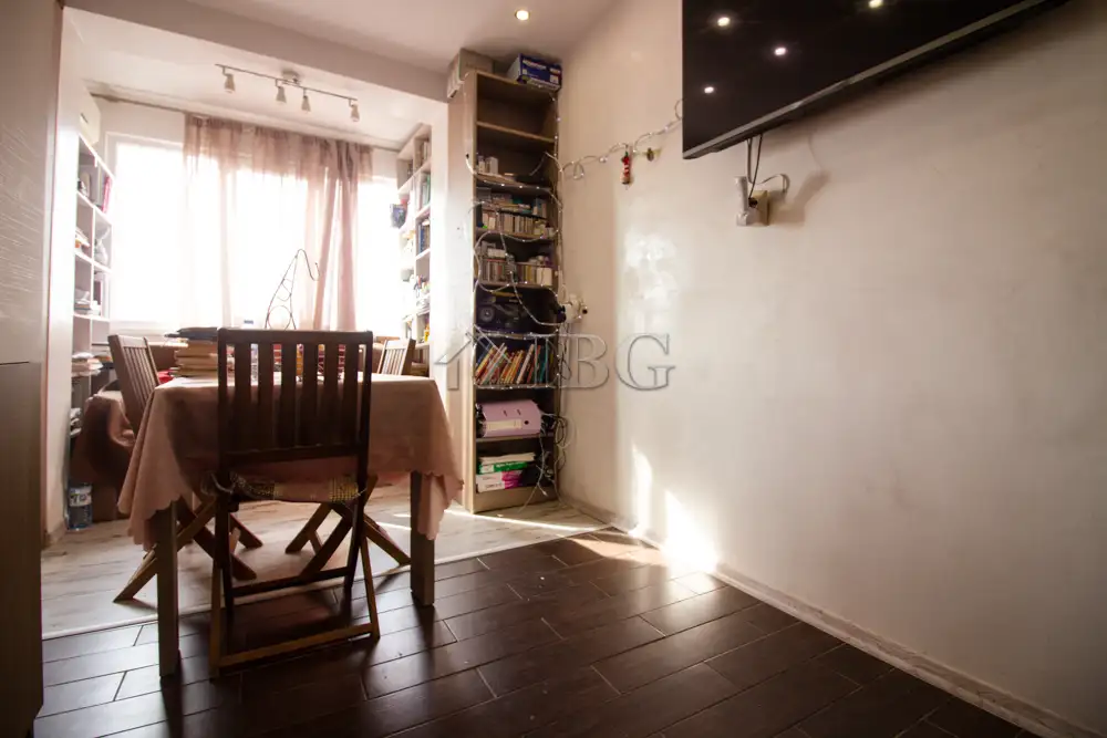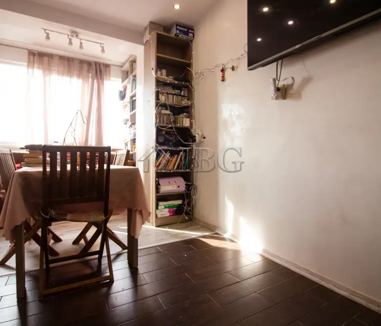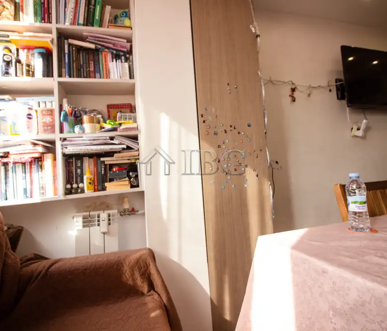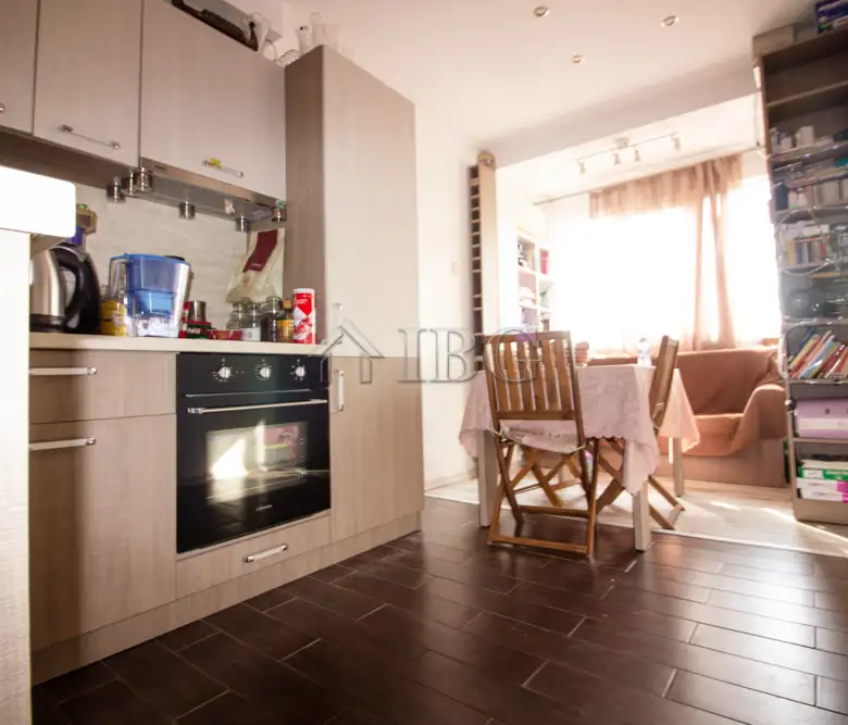 The apartment for sale is with area of 52.00 sq.m. and it consists of a corridor, kitchen with dining area, large and bight living room, which currently is distributed between parent bedroom and children’s room with access to a sunny glazed terrace and a bathroom with toilet. The apartment is fully renovated with quality and expensive materials and custom furniture. The property is with quality joinery, outher insulation and central heating, very bright and warm. There are installed air conditioners for heating and cooling. The property offers and basement which is situated on the 3rd floor and it is transformed in a cabinet. The apartment is for sale fully furnished and equipped, ready to move in.